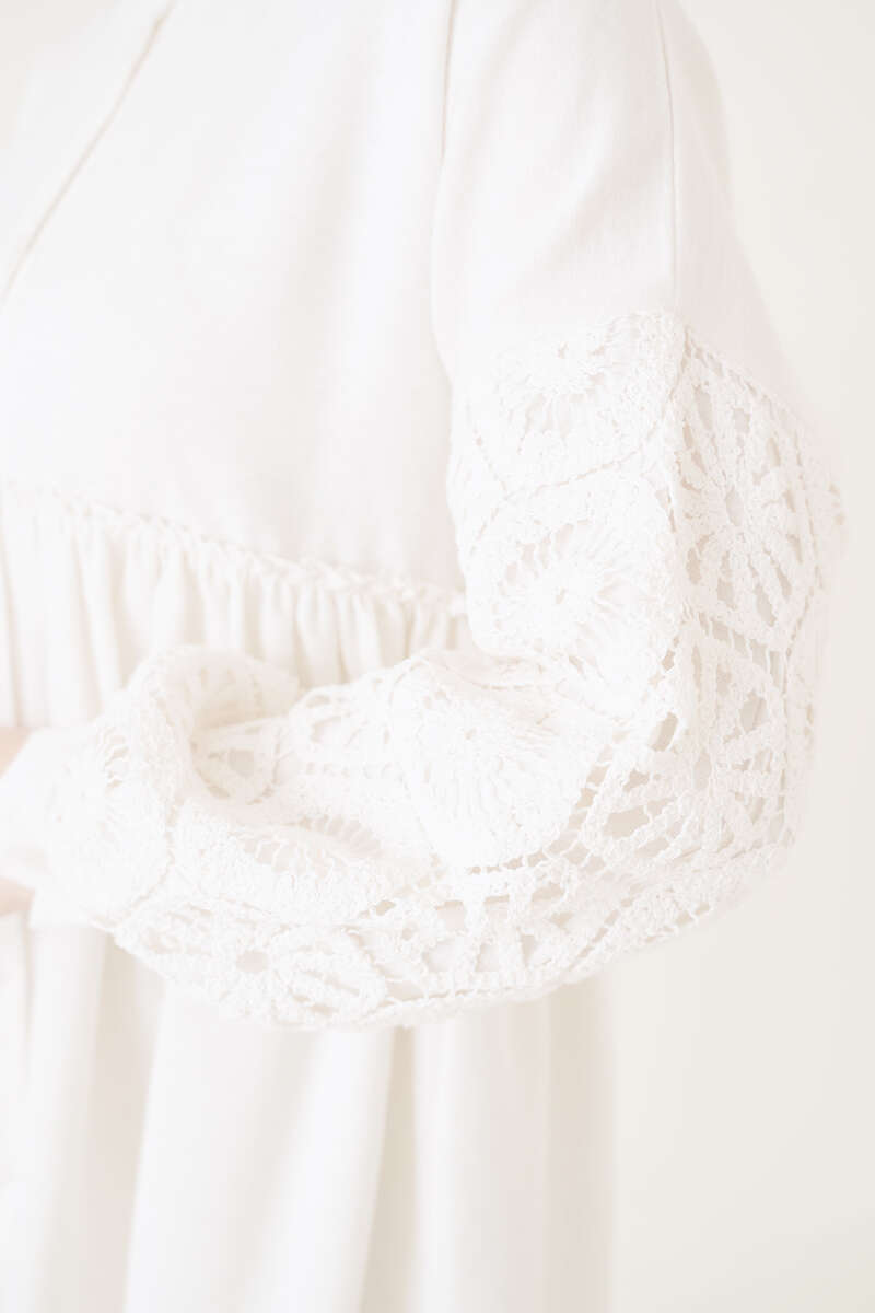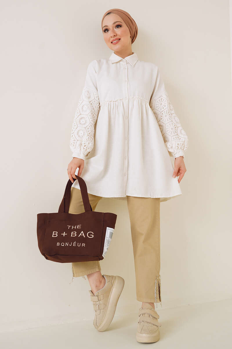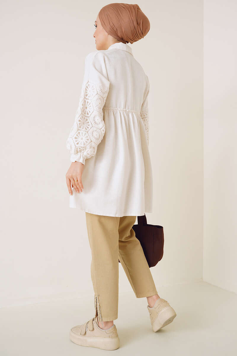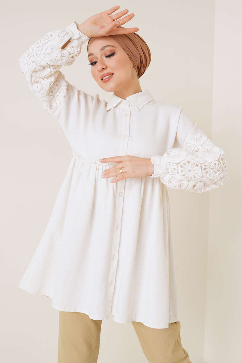 Yeni sezon keten gömleğimiz kollarında dantel güpür detaylarıyla beğebileri üzerinde toplamaktadır. Bilekleri manşetli olan gömleğimizin düğmeleri şeffaftır. Klasik yaka gömleğimizin beli büzgü detaylıdır.