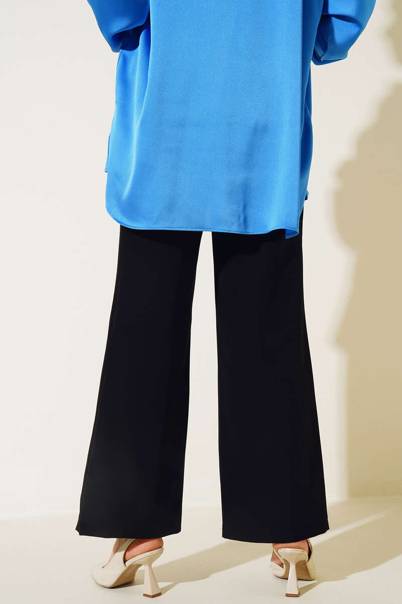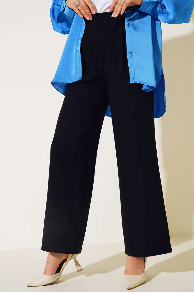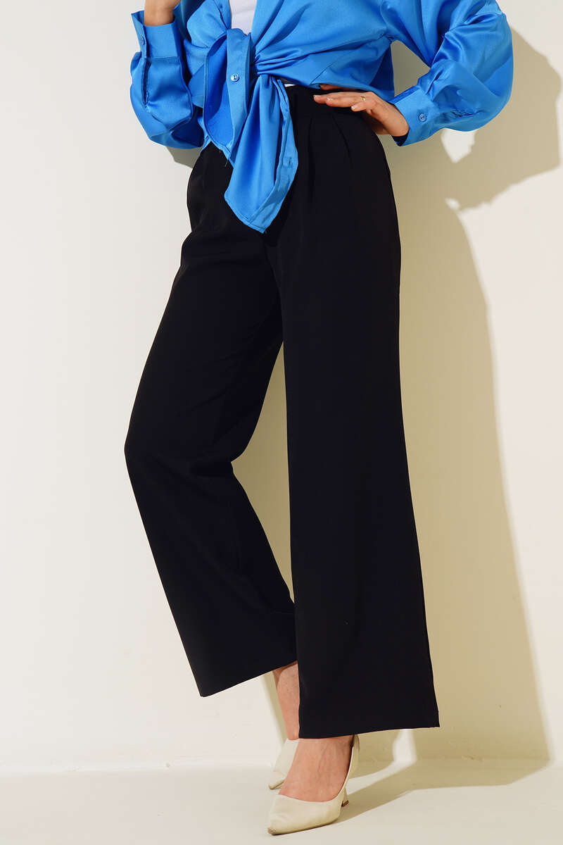 Yeni sezon bol paça pantolonumuz sportif şıklığı seizlere sunmaktadır. Çift pileli pantolonumuz bol paçadır. Beli cırtlı ve fermuarlı olan pantolunumuz cepsiz modeldir.