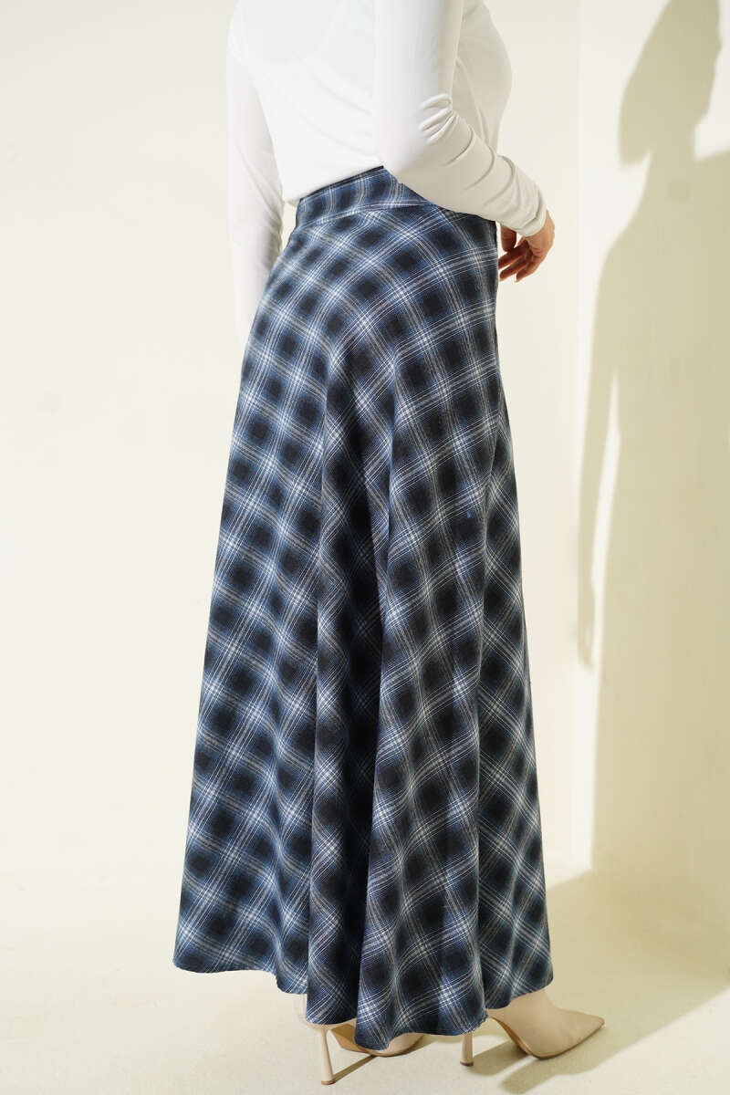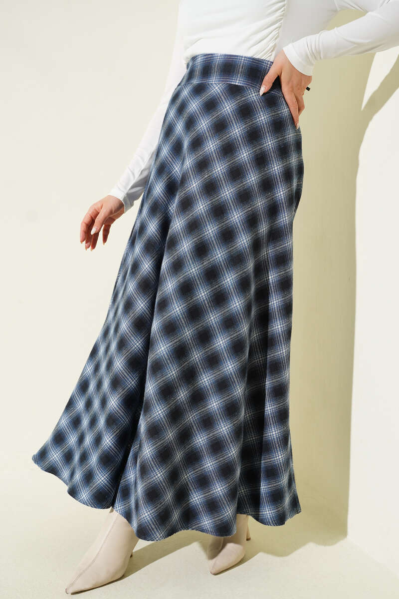 Kemerli Ekose Desen Kloş Etek Lacivert