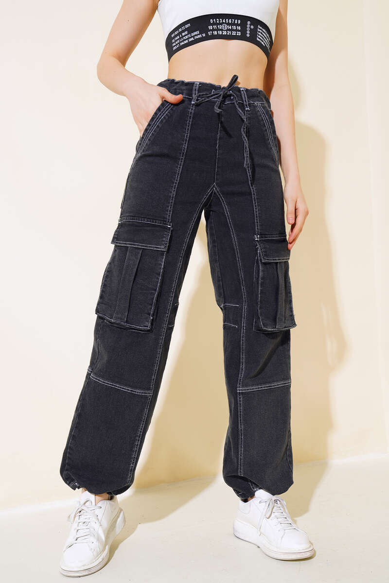 Beli İp Bağcıklı Kargo Cep Pantolon Füme