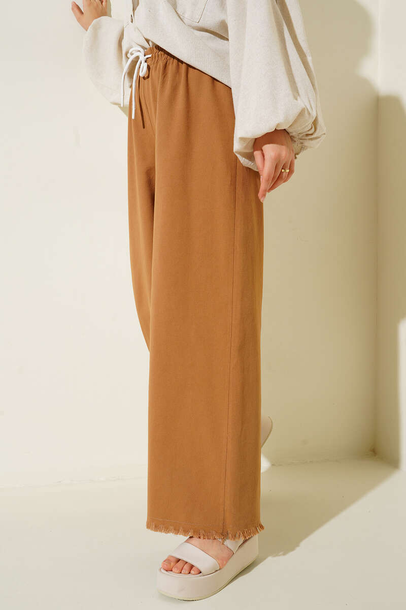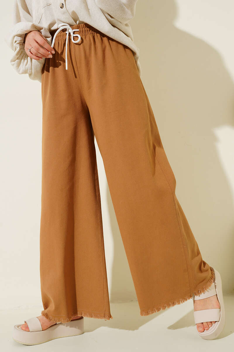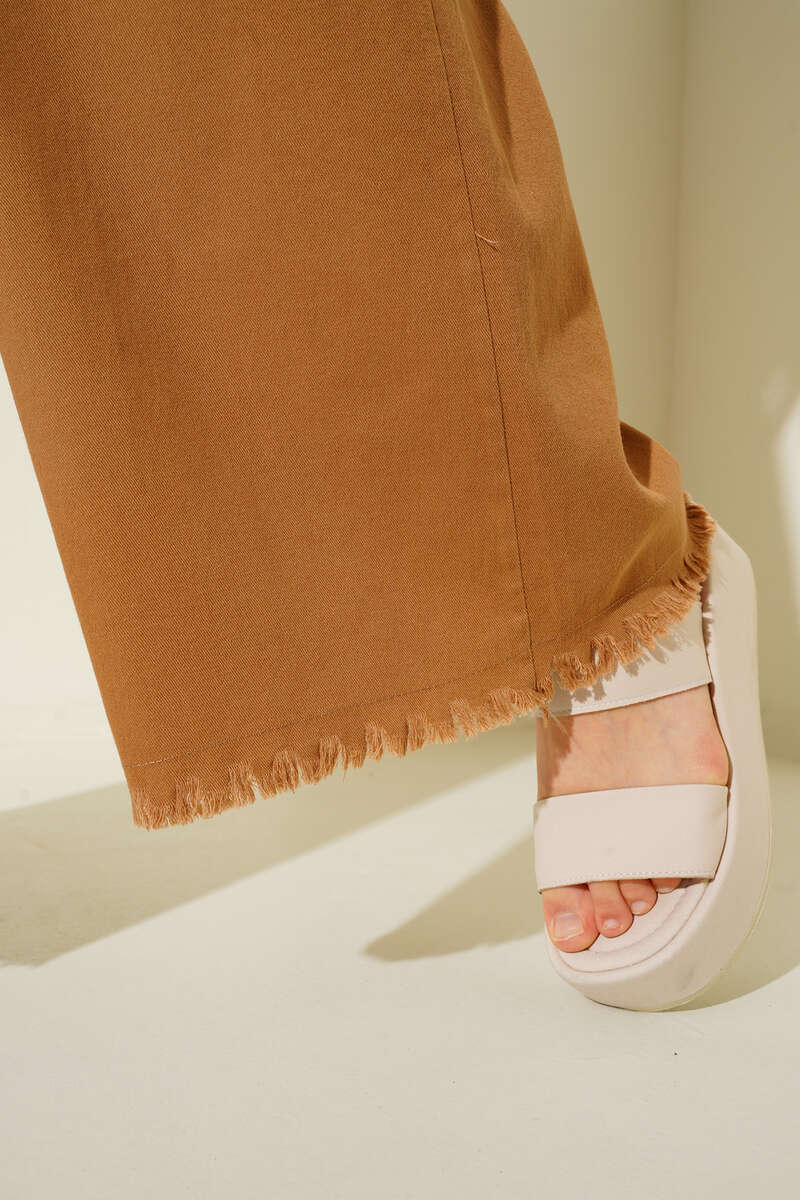 Beli İp Bağlamalı Paçası Yırtık Detaylı Pantolon Camel