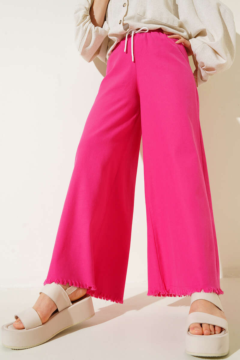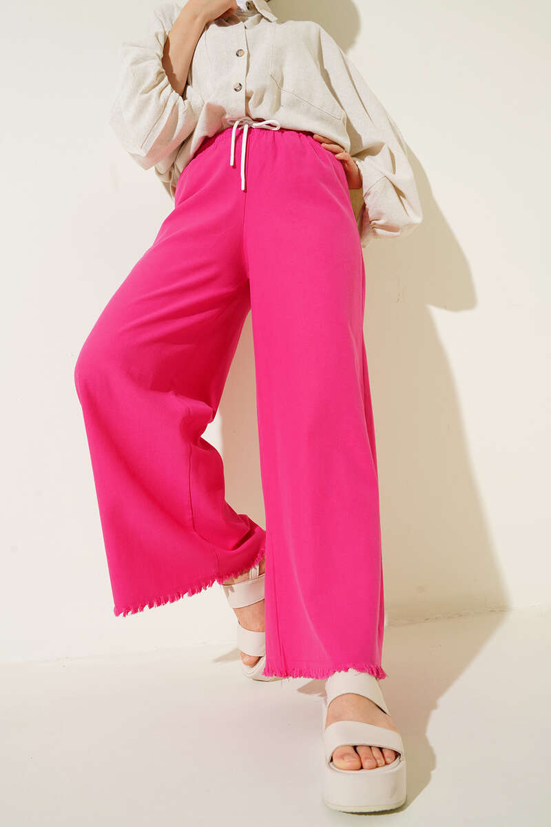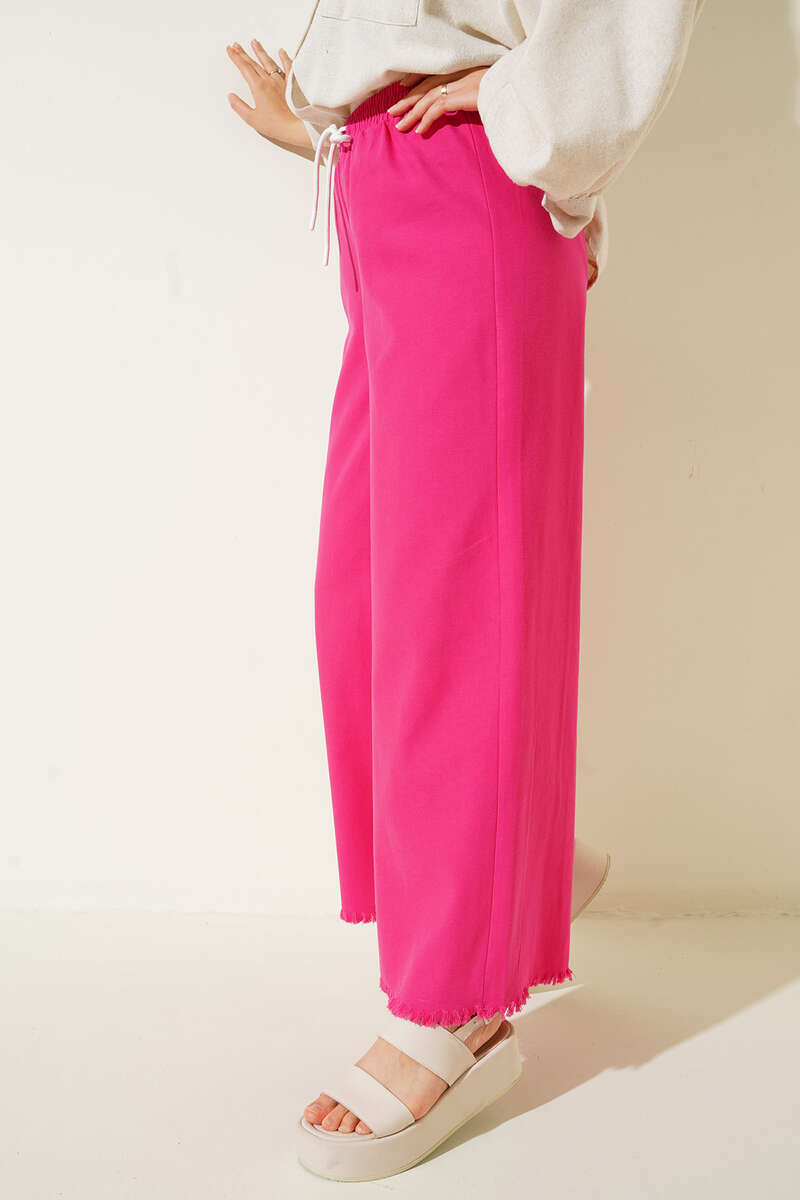 Beli İp Bağlamalı Paçası Yırtık Detaylı Pantolon Fusya