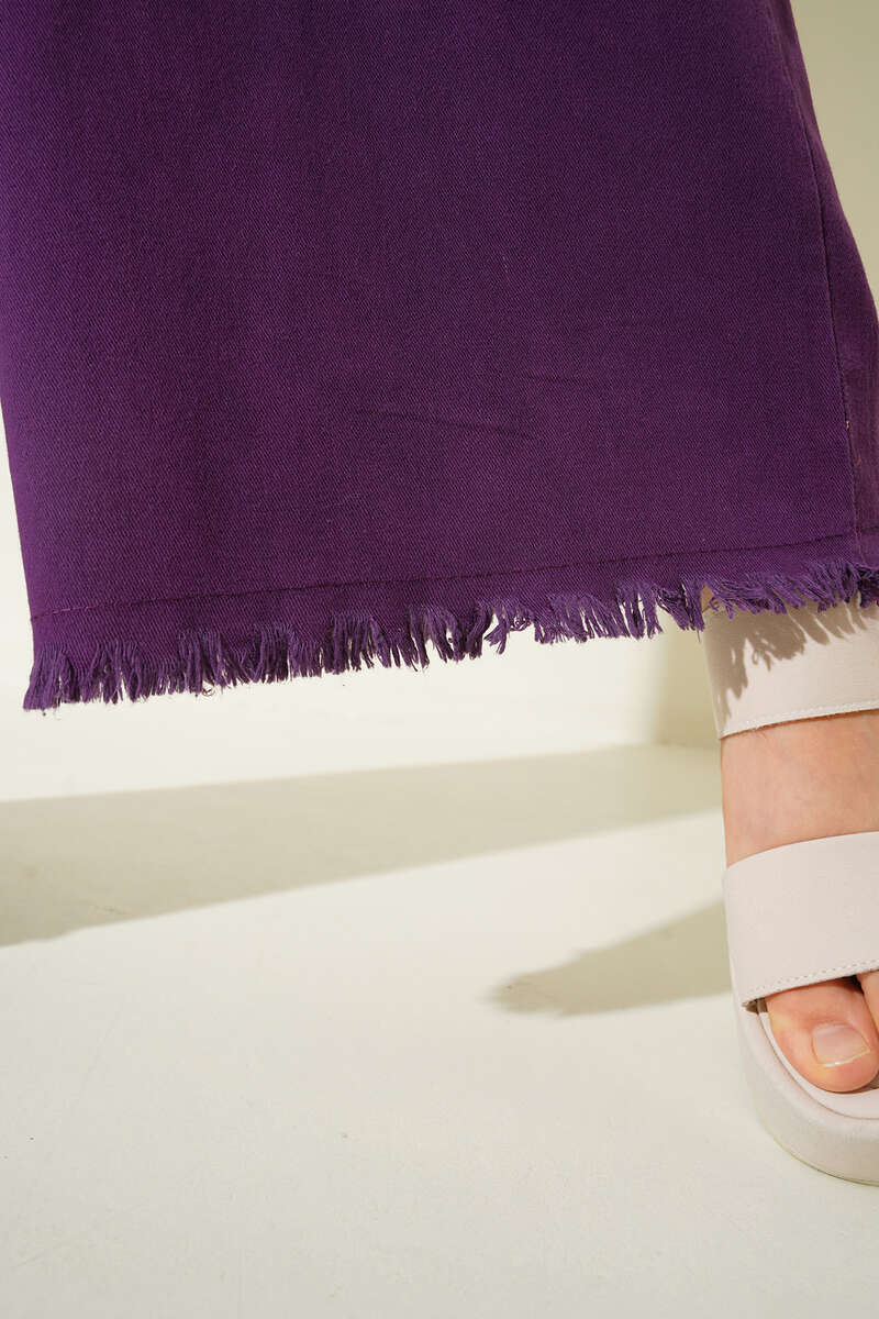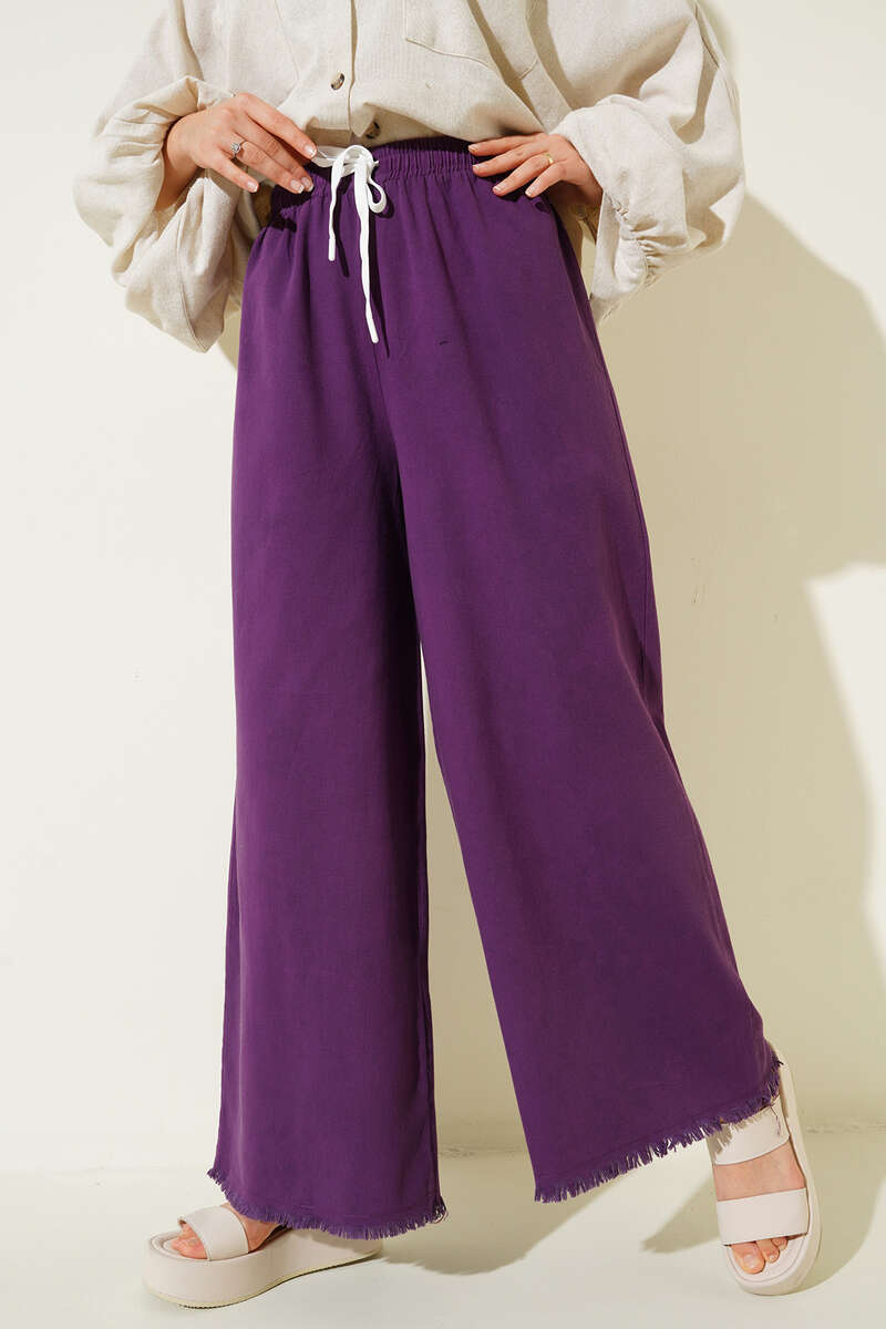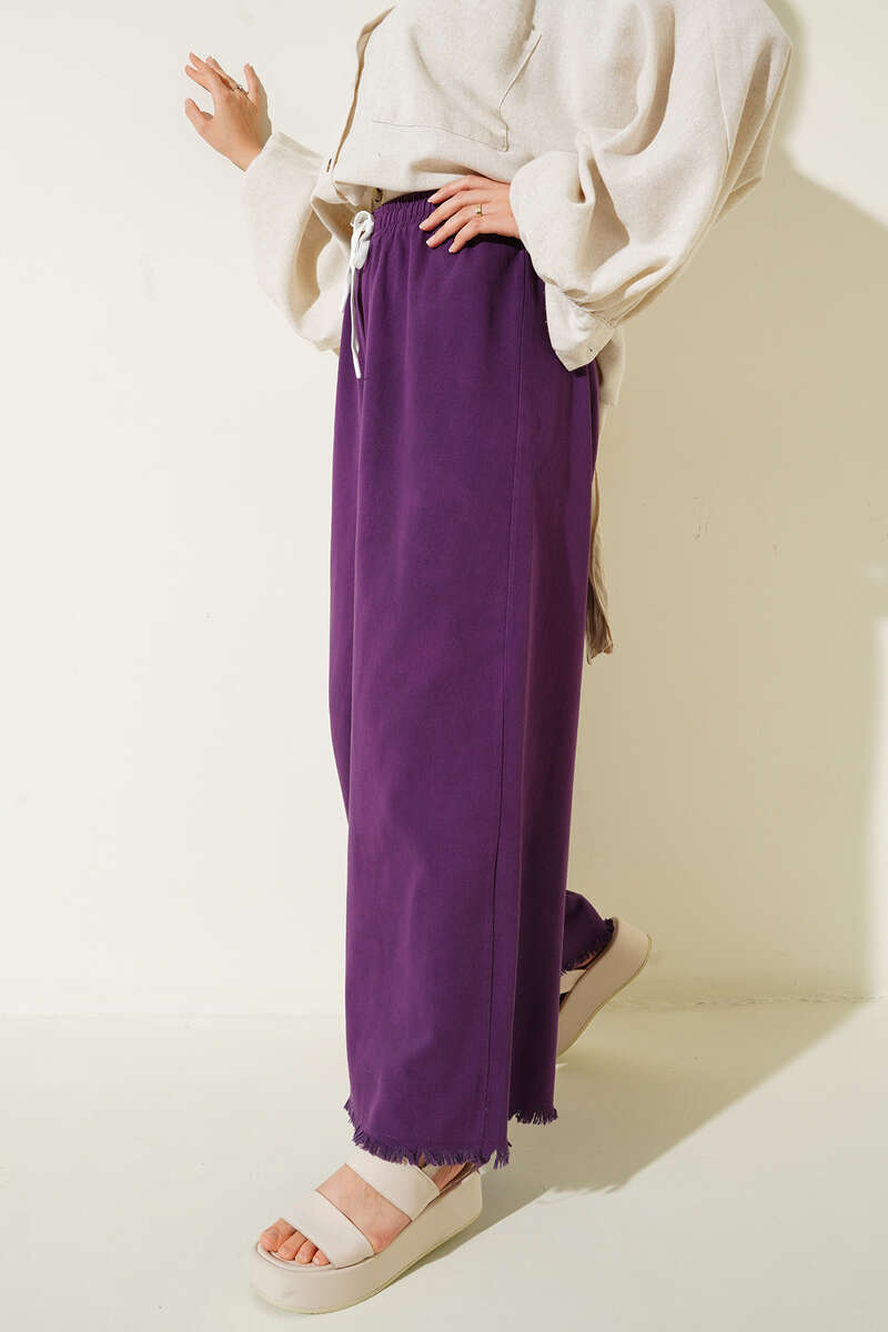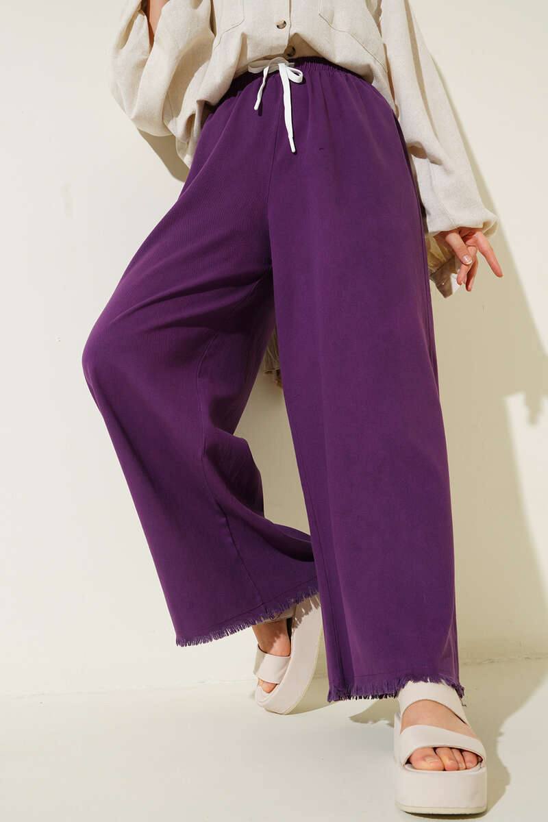 Beli İp Bağlamalı Paçası Yırtık Detaylı Pantolon Mor
