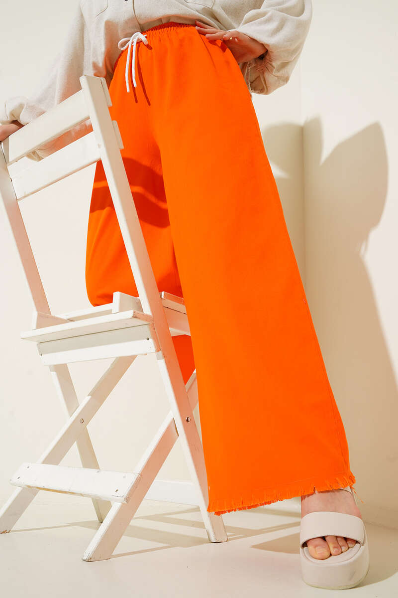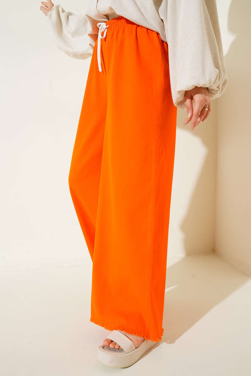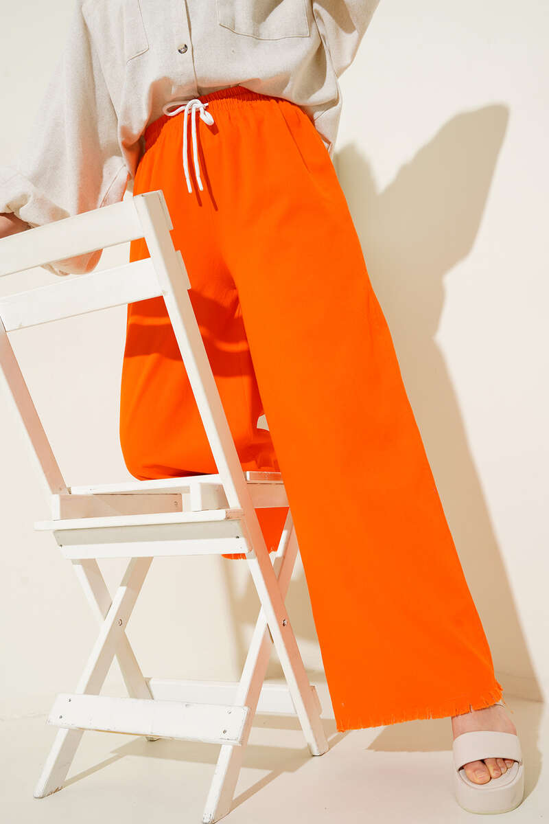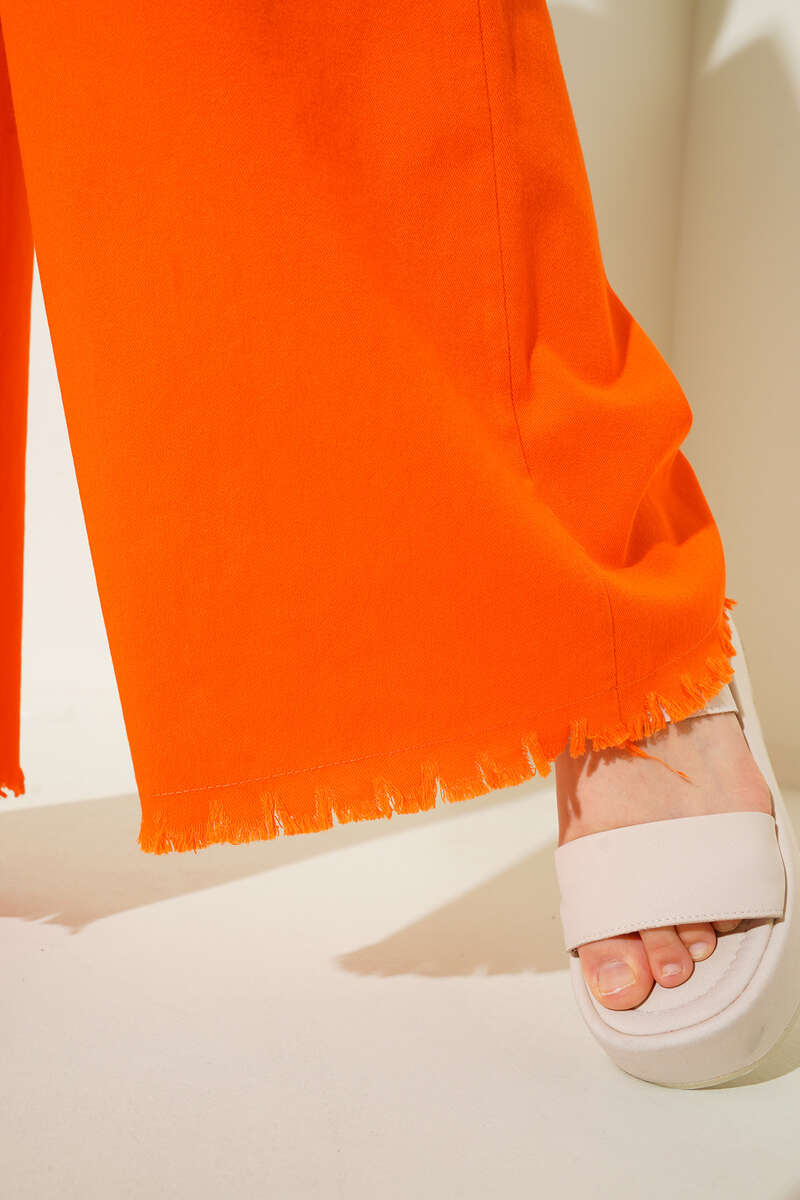 Beli İp Bağlamalı Paçası Yırtık Detaylı Pantolon Oranj