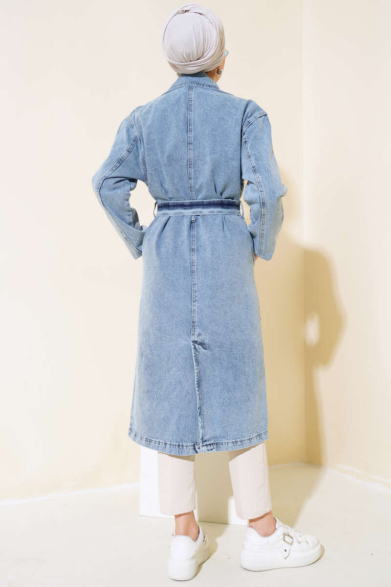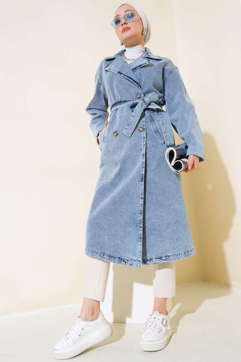 Beli Kuşaklı Uzun Trençkot Kot Mavisi