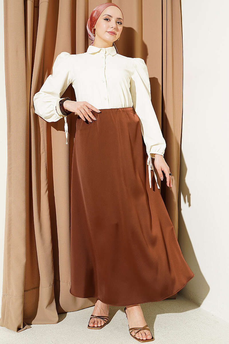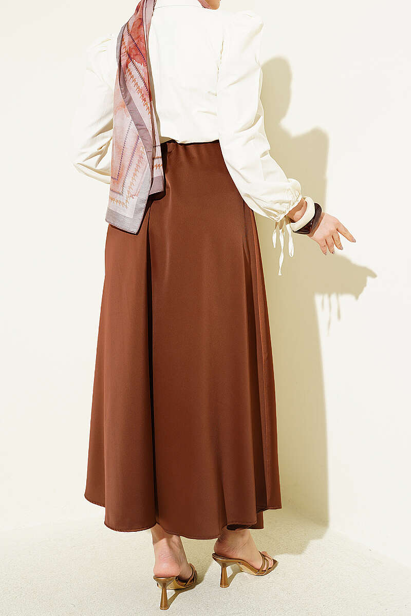 Saten kumaşın kendine has hafif ışıltısı ve pürüzsüz dokusuyla tasarlanan bu etek, yalın tasarımıyla asil bir şıklık sunuyor. Beli lastikli yapısı sayesinde gün boyu konforlu bir kullanım sağlarken, dökümlü kesimi her adımda zarif bir silüet oluşturuyor. Hem günlük spor kombinlerde hem de şık davetlerde joker parça olarak değerlendirilebilecek bu tasarım, zamansız çizgisiyle her gardırobun temel ihtiyaçlarından biridir. Minimalist estetiği ve kaliteli dokusuyla farklı üst gruplarıyla kolayca uyum sağlayarak çabasız bir zarafet vaat ediyor.