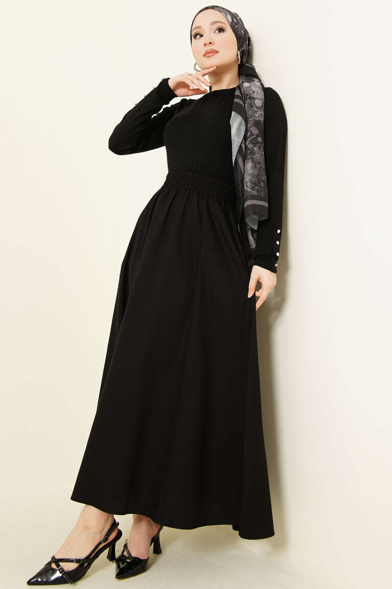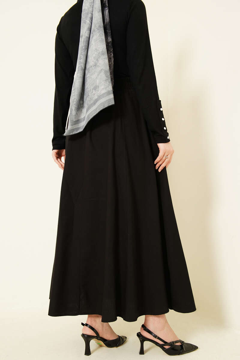 Bel Lastikli Desenli Pileli Etek Siyah