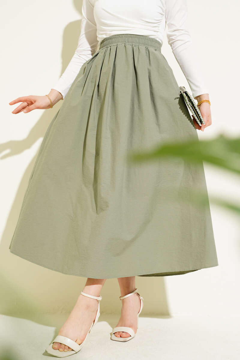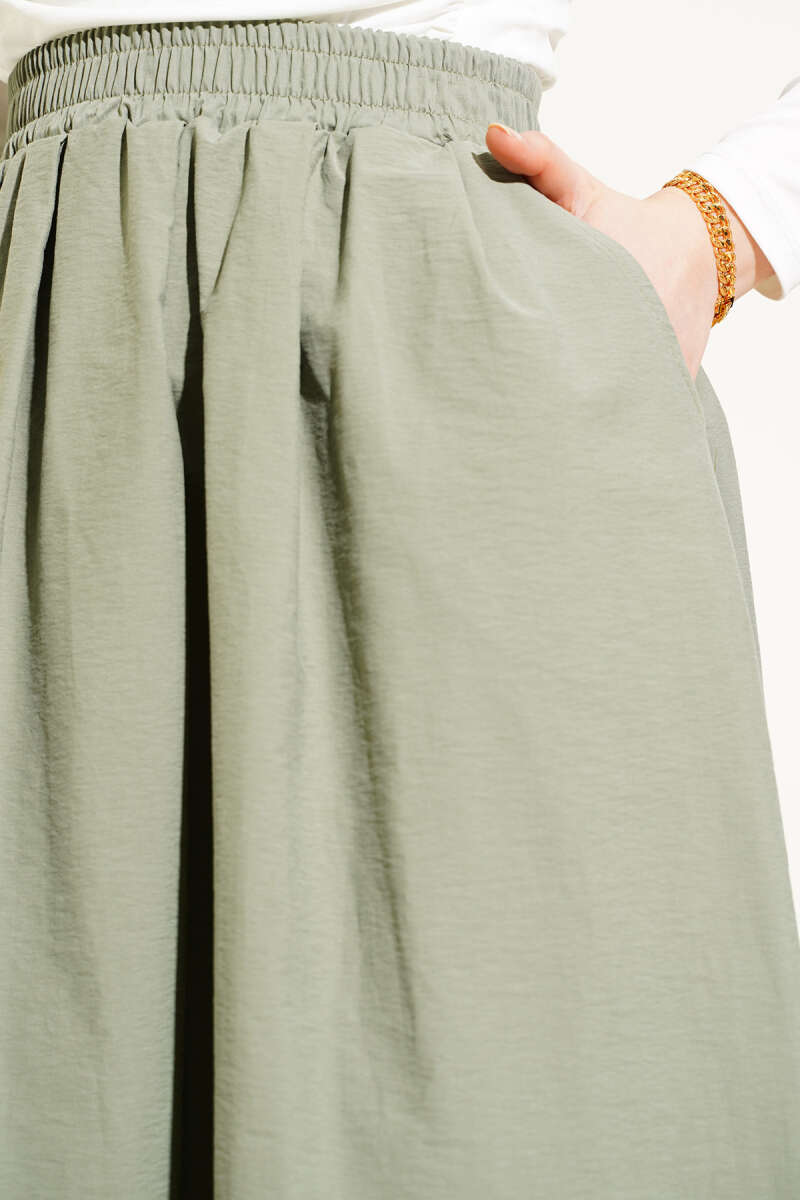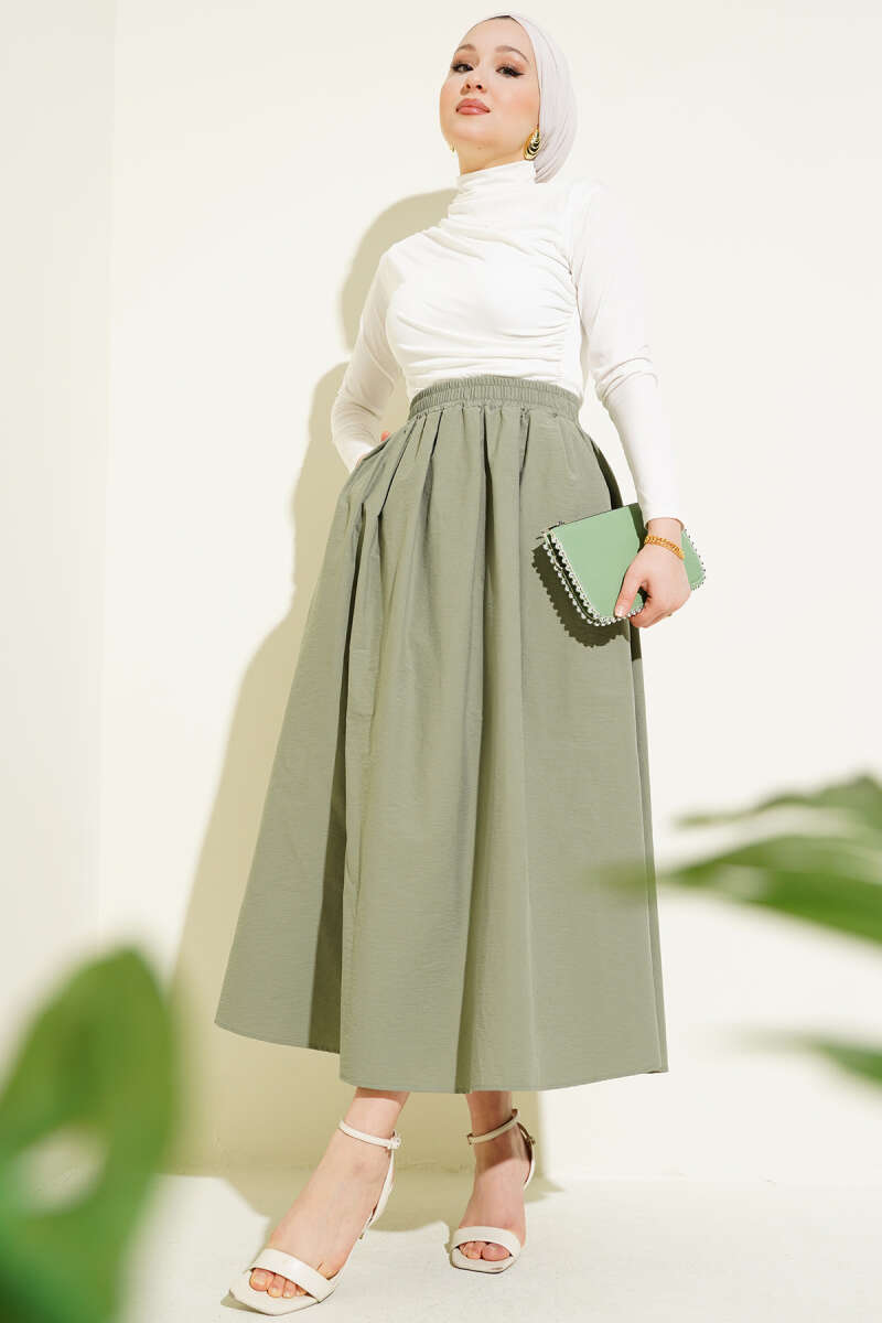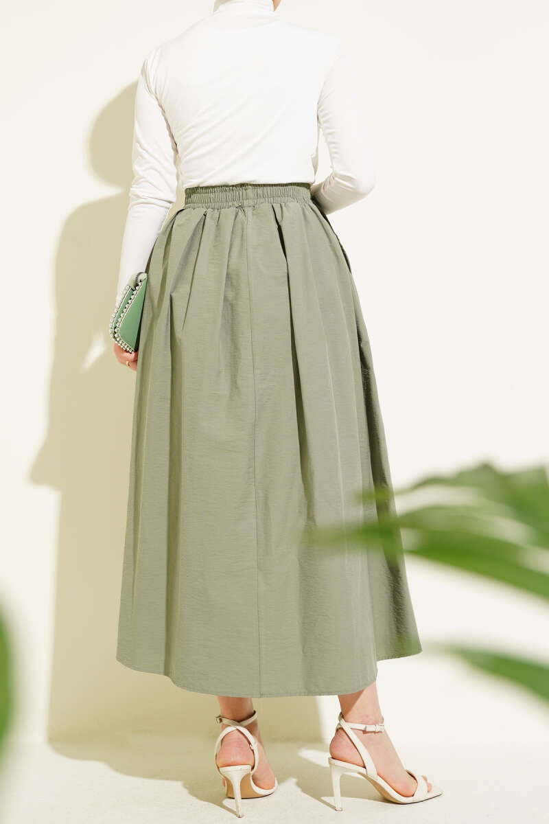 Ekose Desenli Düğmeli Kloş Etek Haki