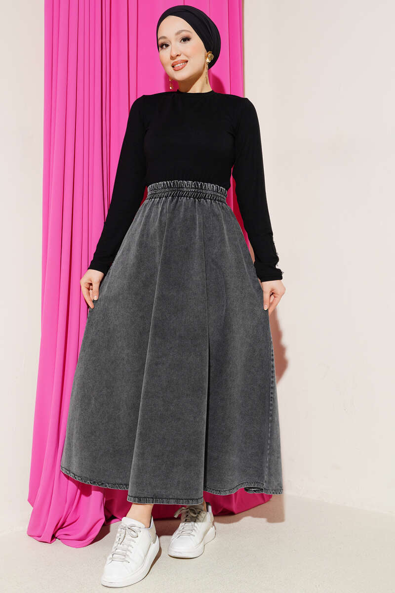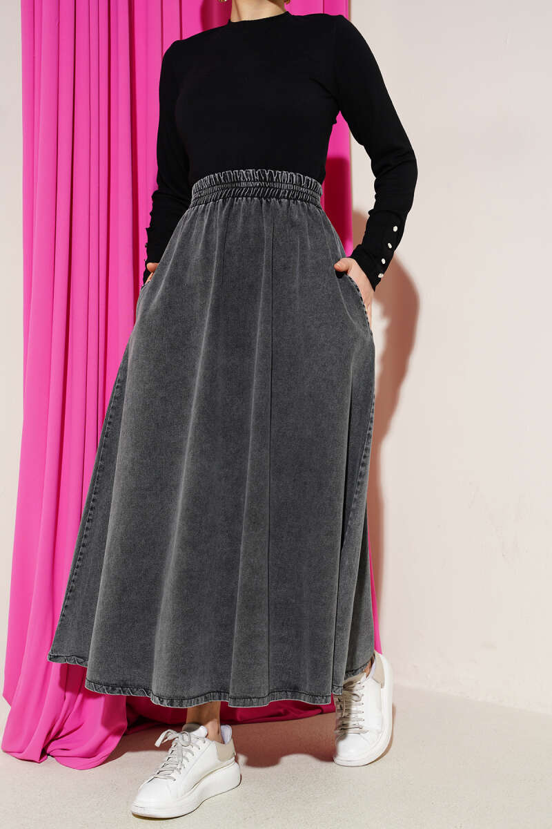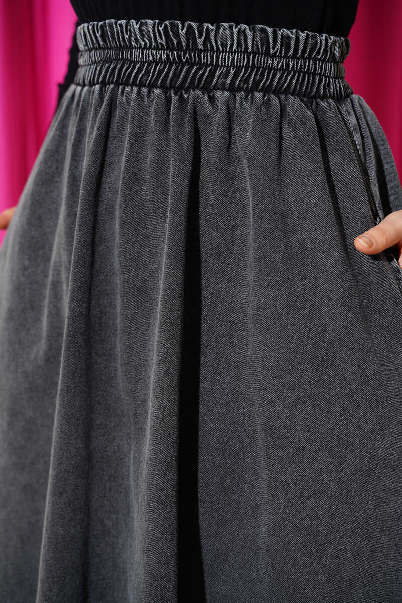 Beli Lastikli Cepli Kloş Kot Etek Füme