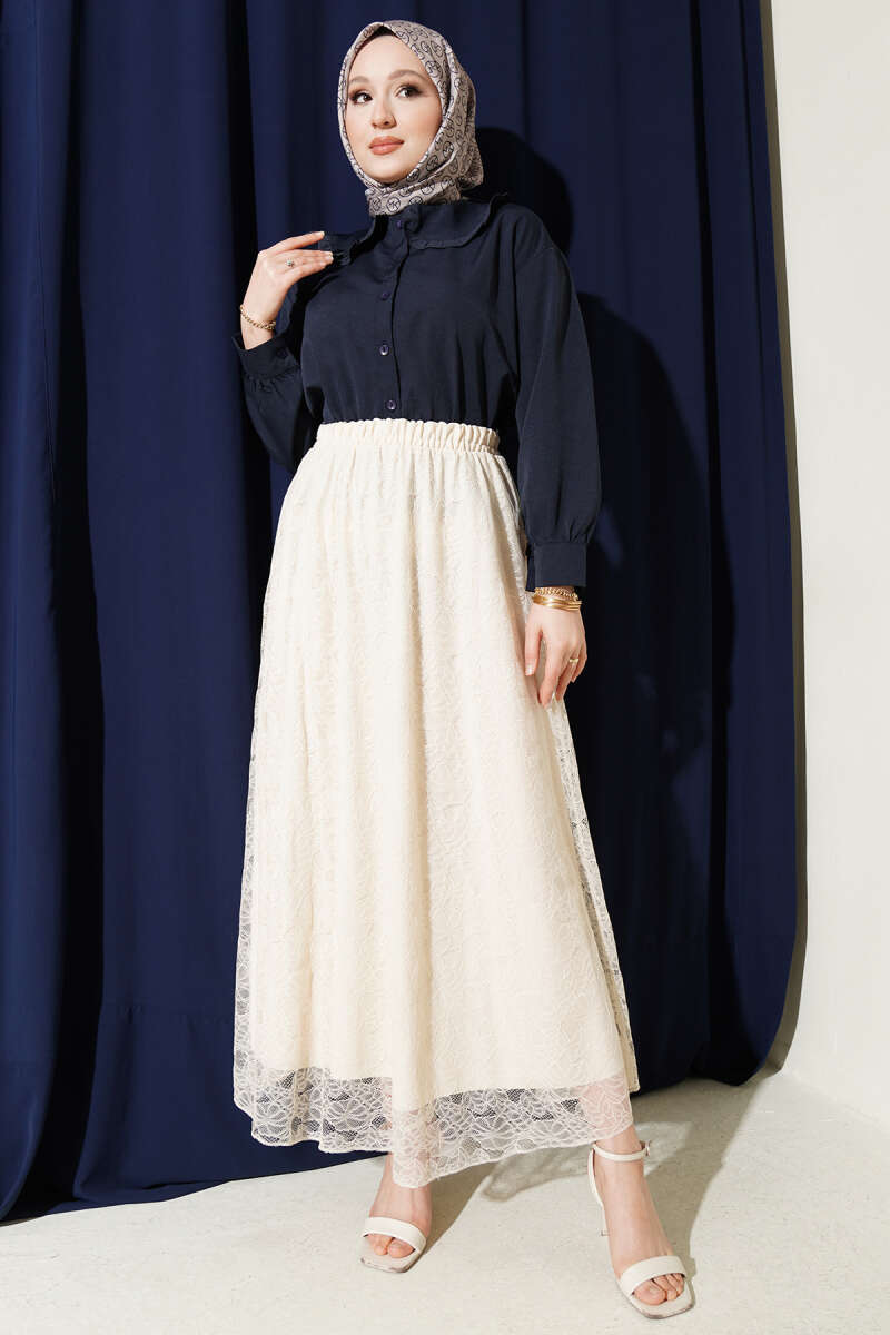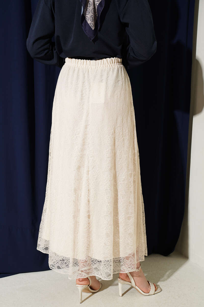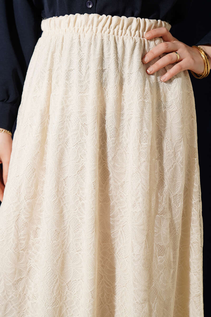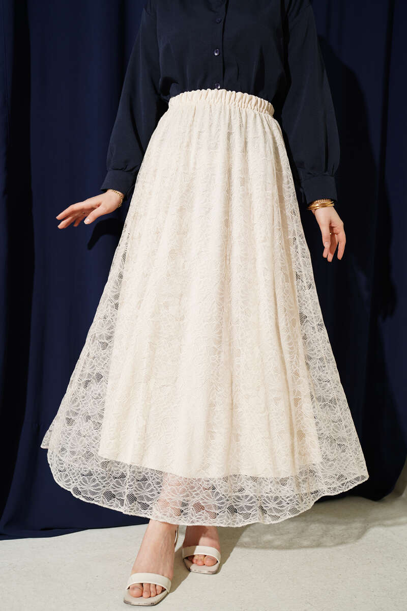 Beli Lastikli Çiçek Dantelli Etek Bej
