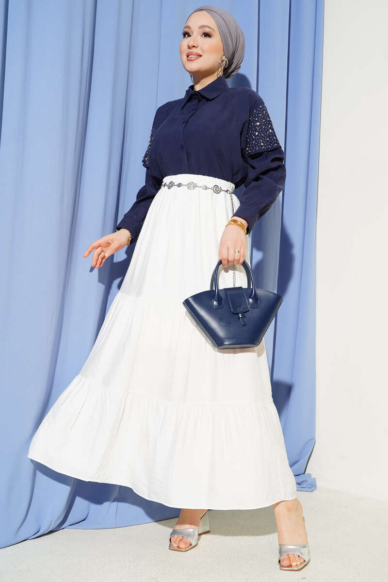 Beli Lastikli Çift Katlı Etek Lacivert