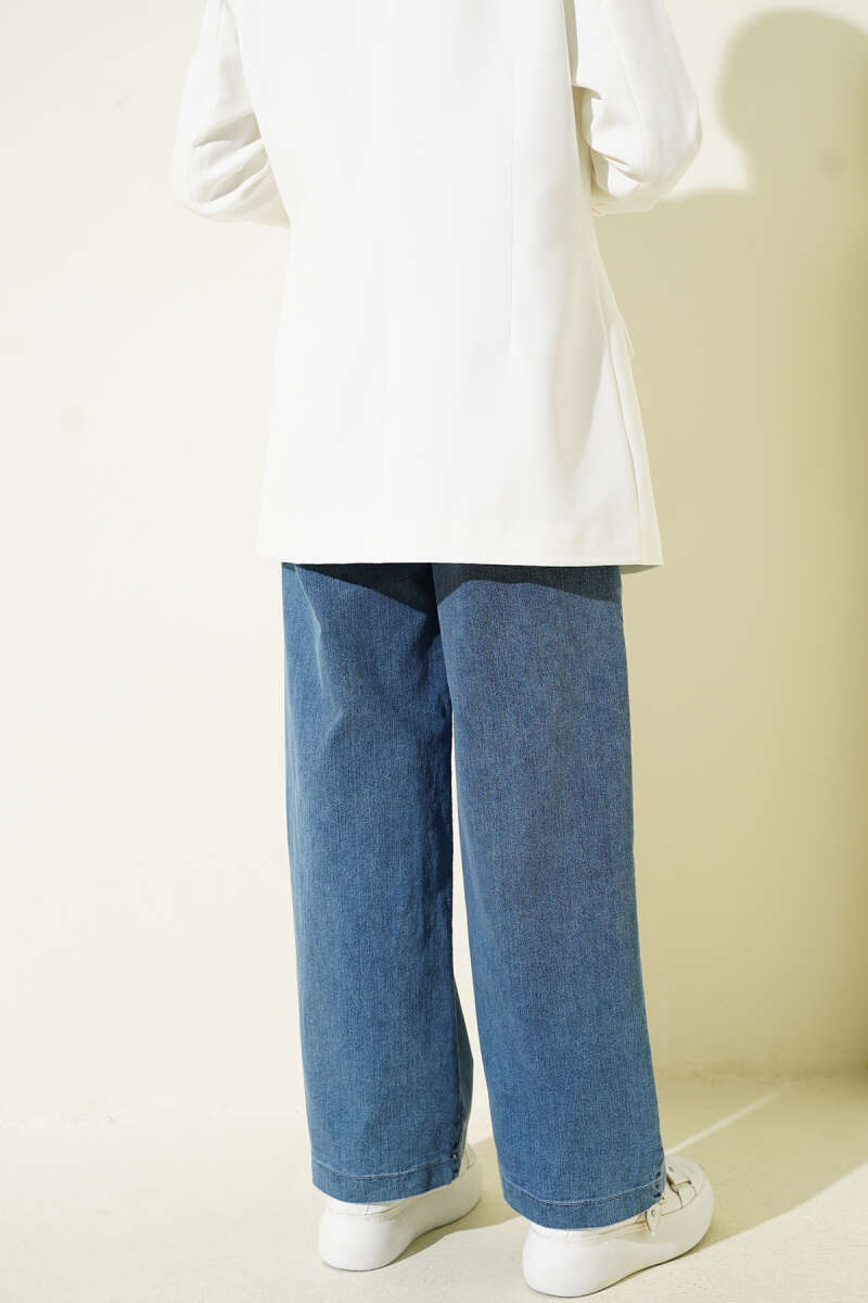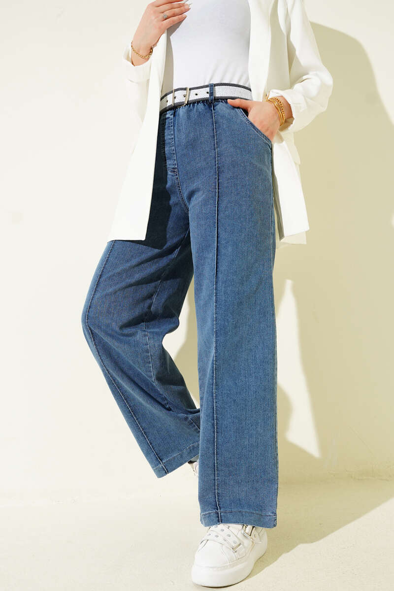 Kuşaklı Beli Lastikli Kot Pantolon Kot Mavisi