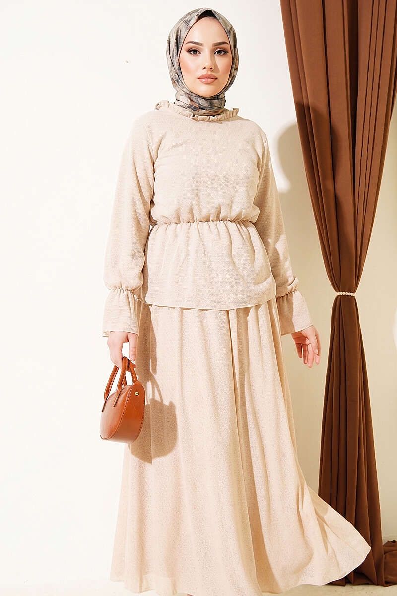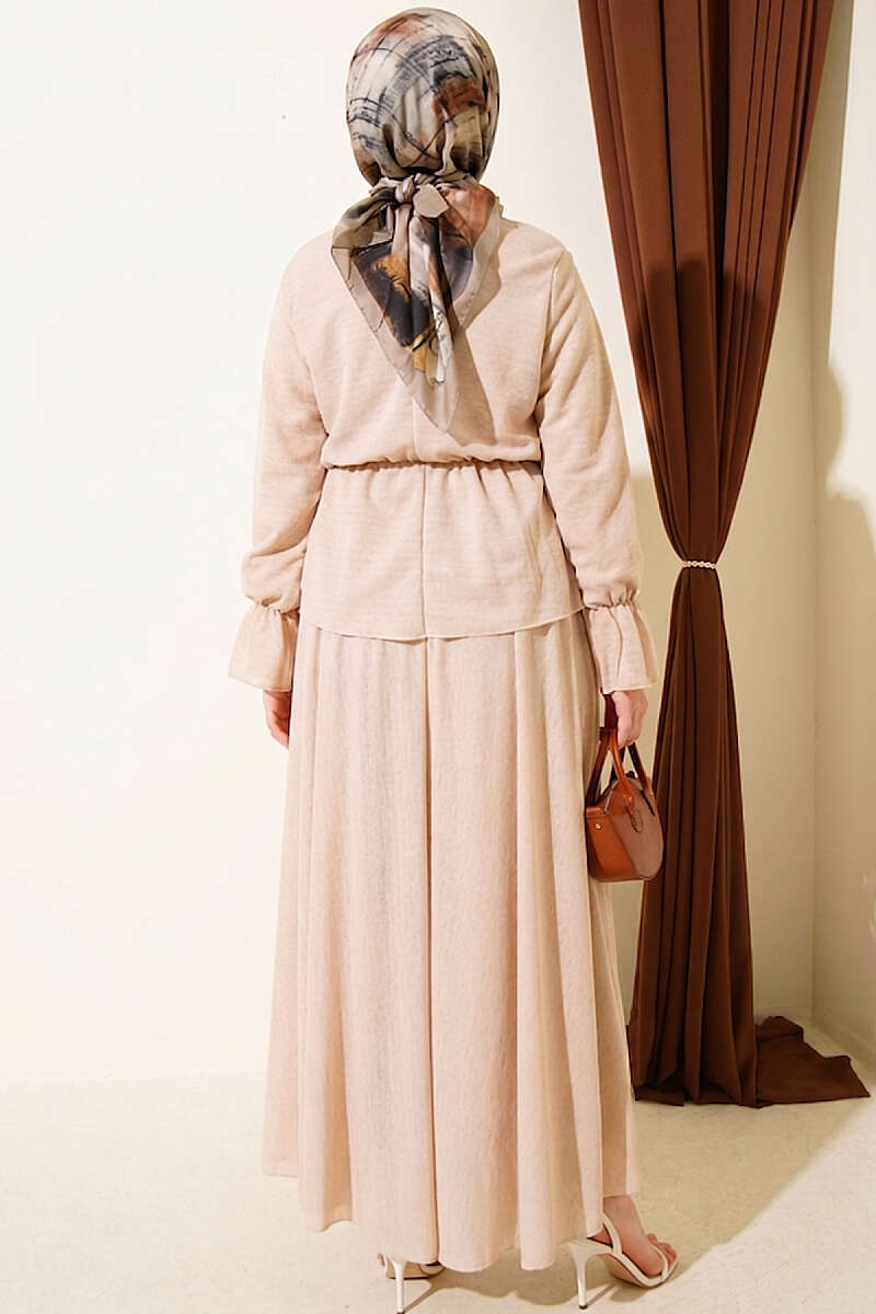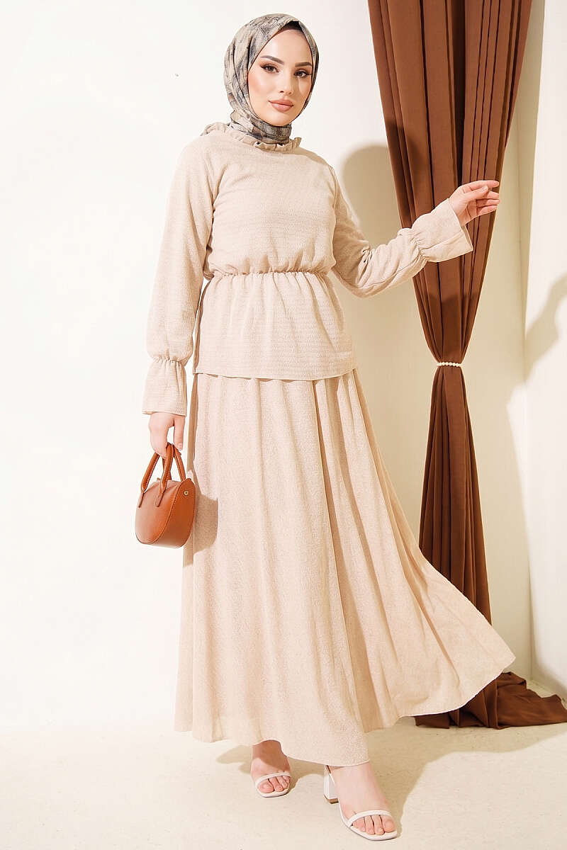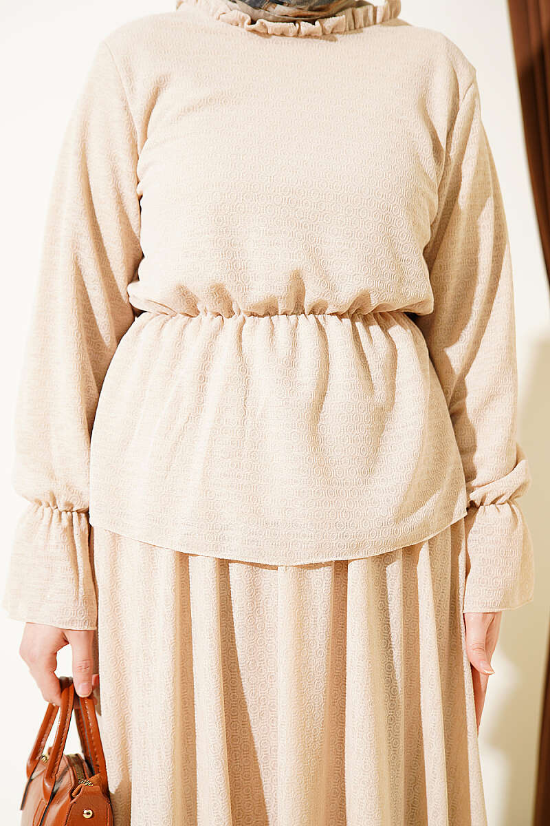 Beli Lastikli Desenli Etekli İkili Takım Bej