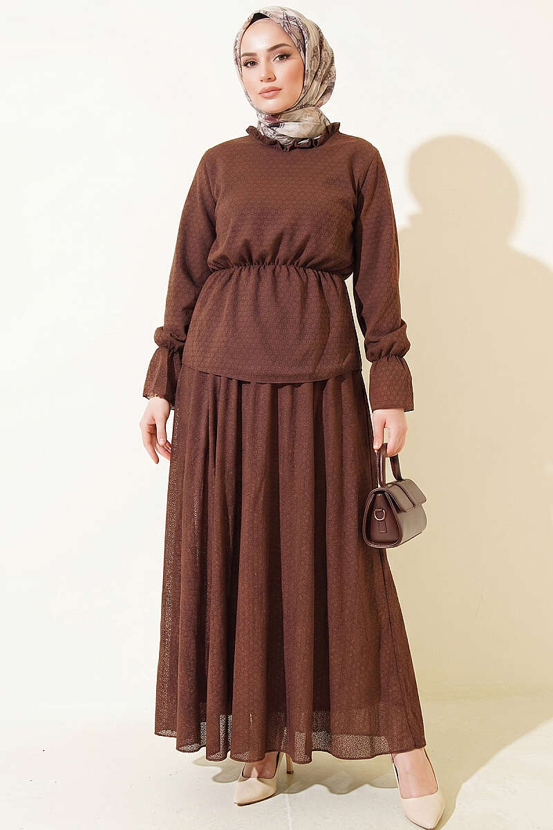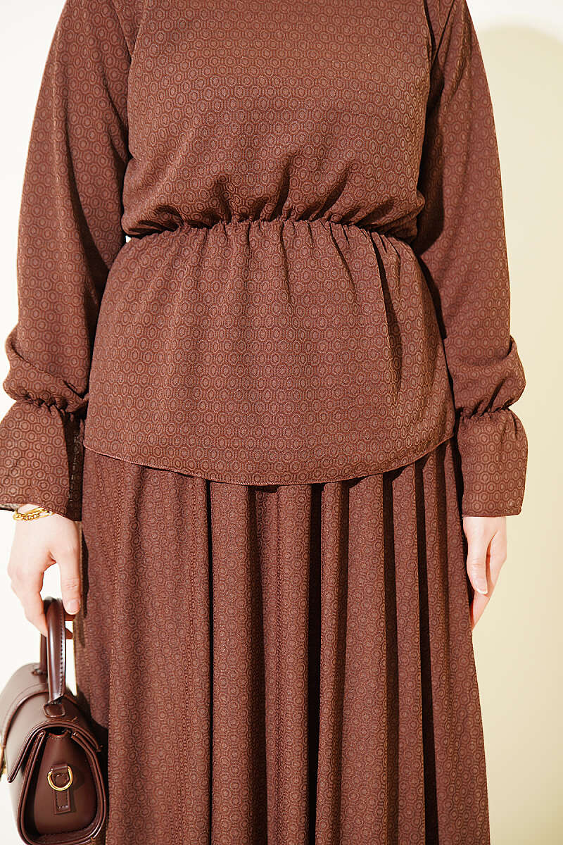 Beli Lastikli Desenli Etekli İkili Takım Kahve