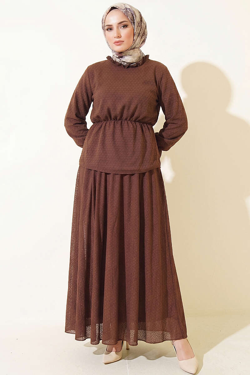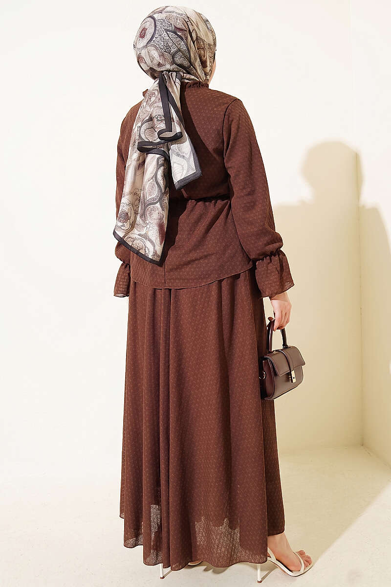 Puantiye Desenli Fularlı Etekli İkili Takım Kahve