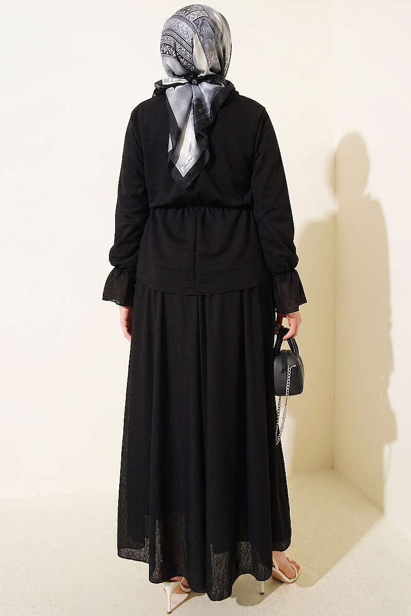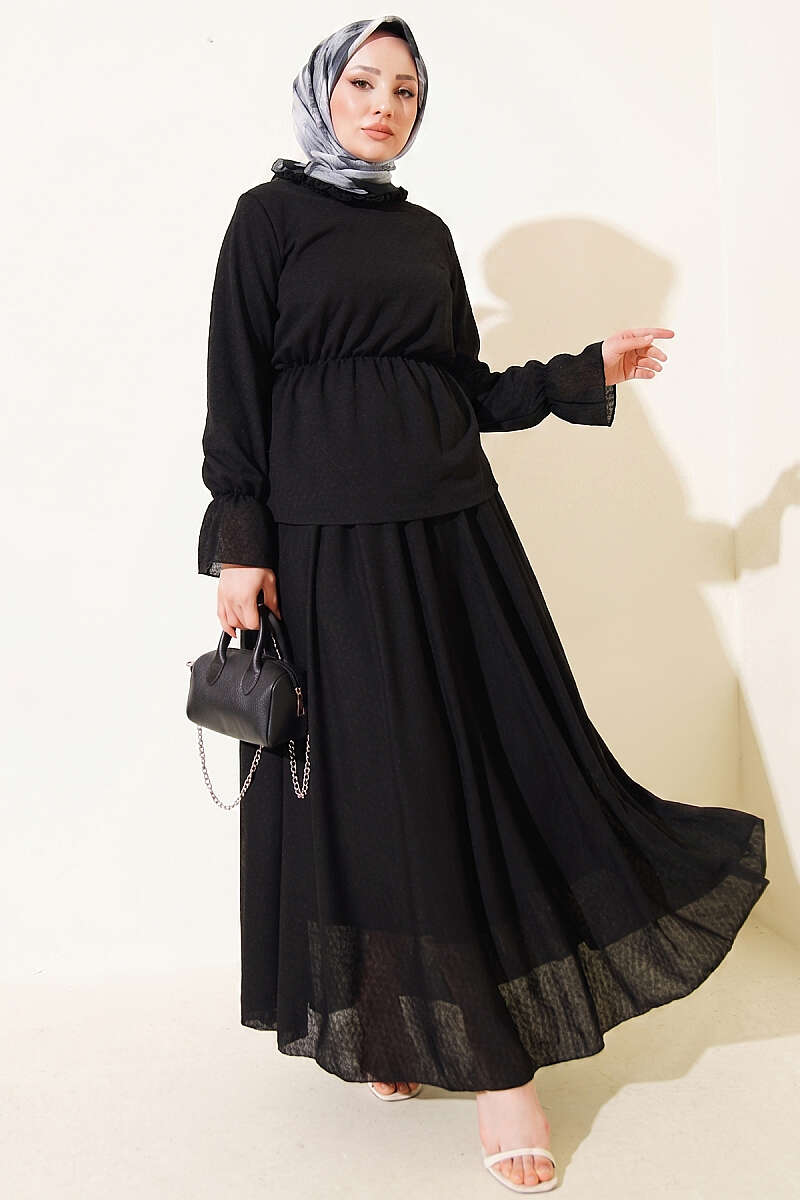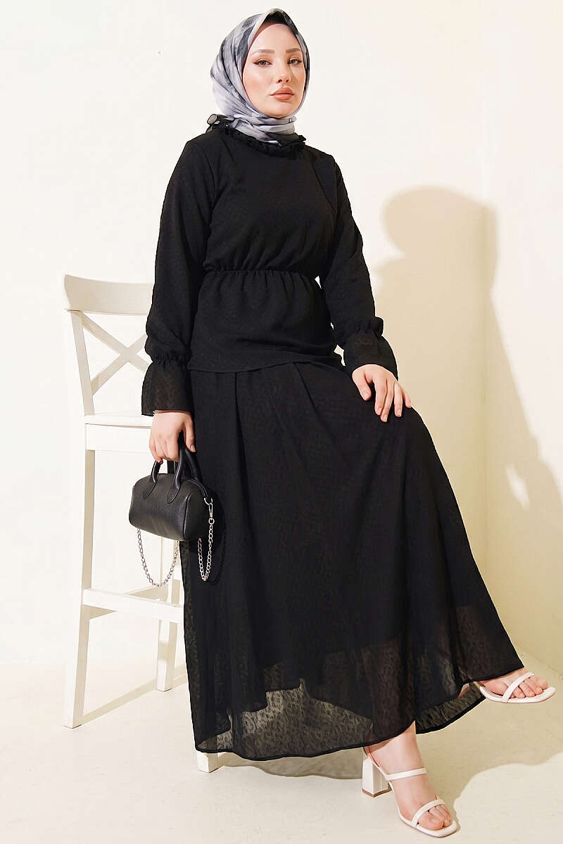 Beli Lastikli Desenli Etekli İkili Takım Siyah