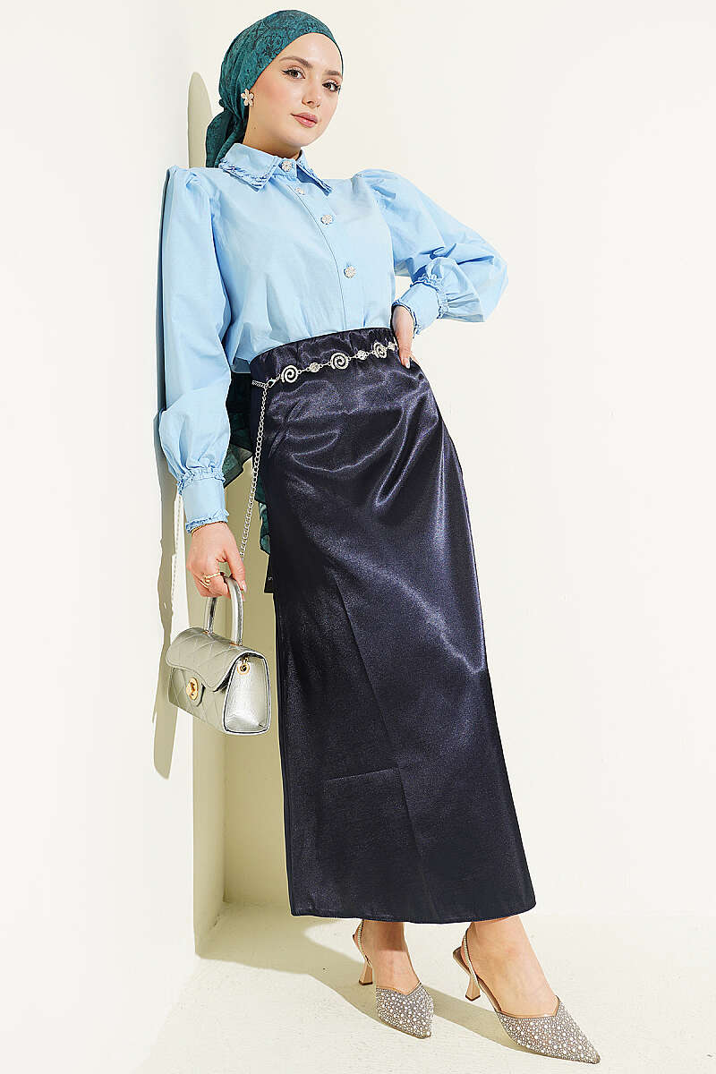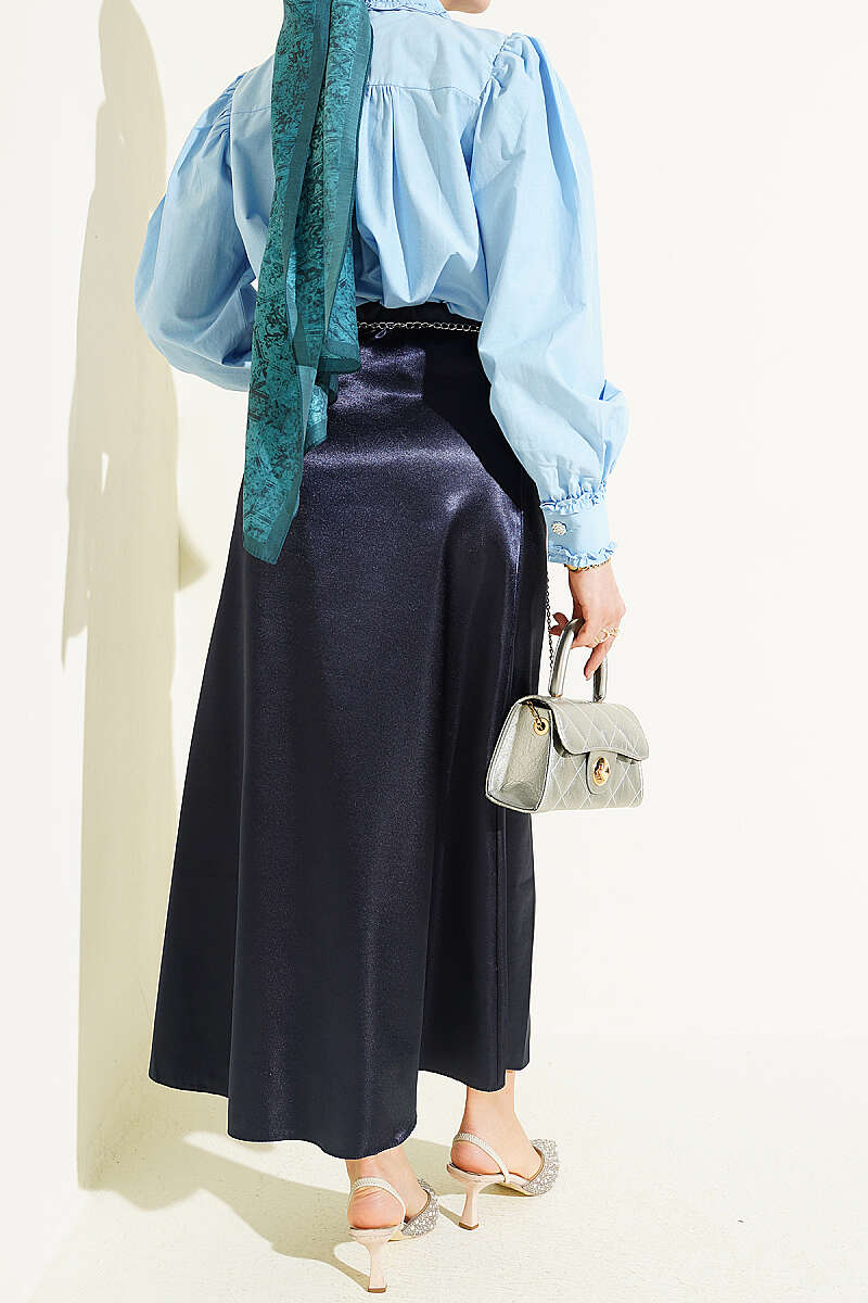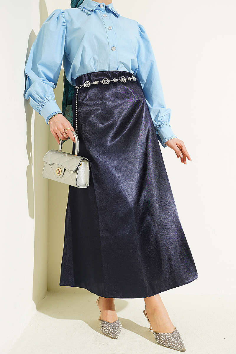 Zarif bir parıltıya sahip olan bu saten etek, pürüzsüz dokusuyla her türlü kombine zahmetsiz bir şıklık katar. Bel kısmındaki esnek lastik detayı sayesinde gün boyu konforlu bir kullanım sunarken, vücuda tam oturan ve aşağı doğru hafifçe genişleyen kesimi modern bir siluet oluşturur. Hem şık akşam davetlerinde hem de günlük stilinizde tercih edebileceğiniz bu dökümlü parça, zamansız tasarımıyla gardırobunuzun kurtarıcı ürünlerinden biri olmaya adaydır.