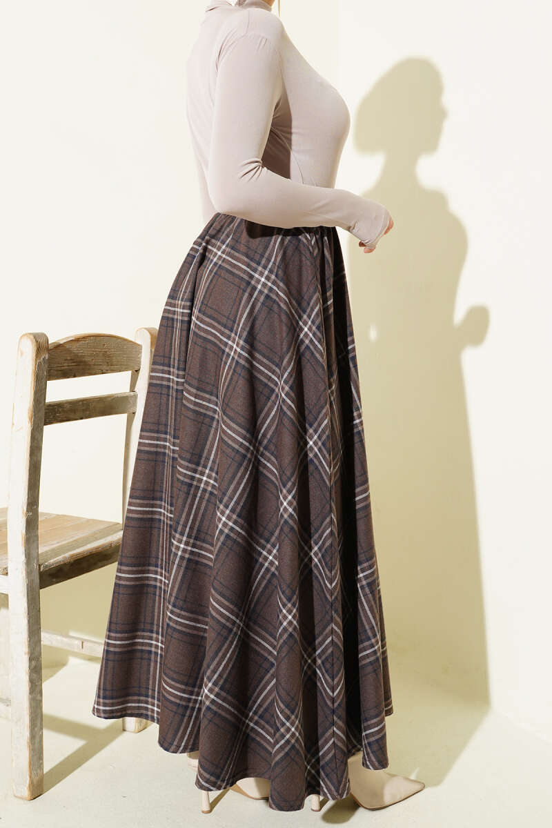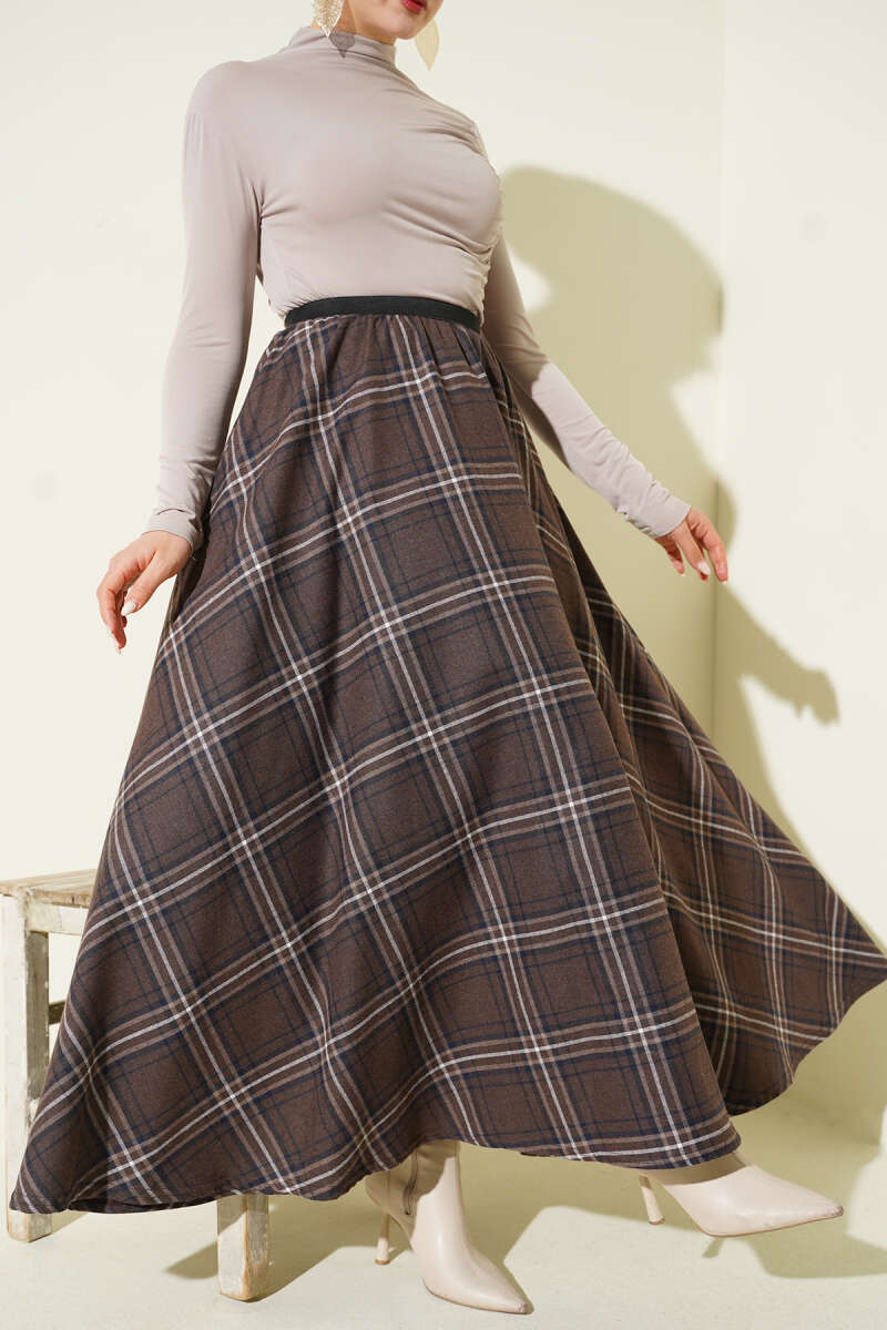 Beli Lastikli Ekose Desen Kloş Etek Bej