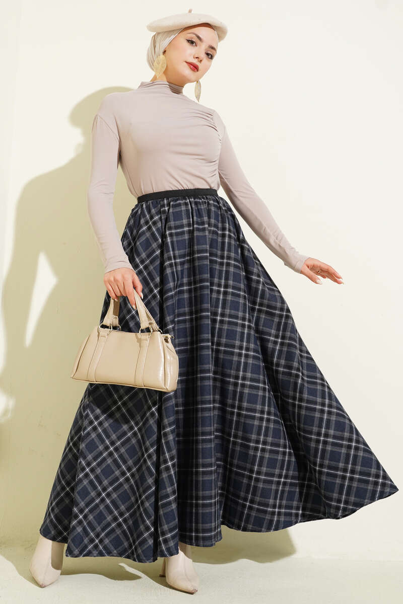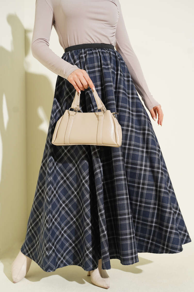 Beli Fermuarlı Ekoseli Çan Etek Lacivert