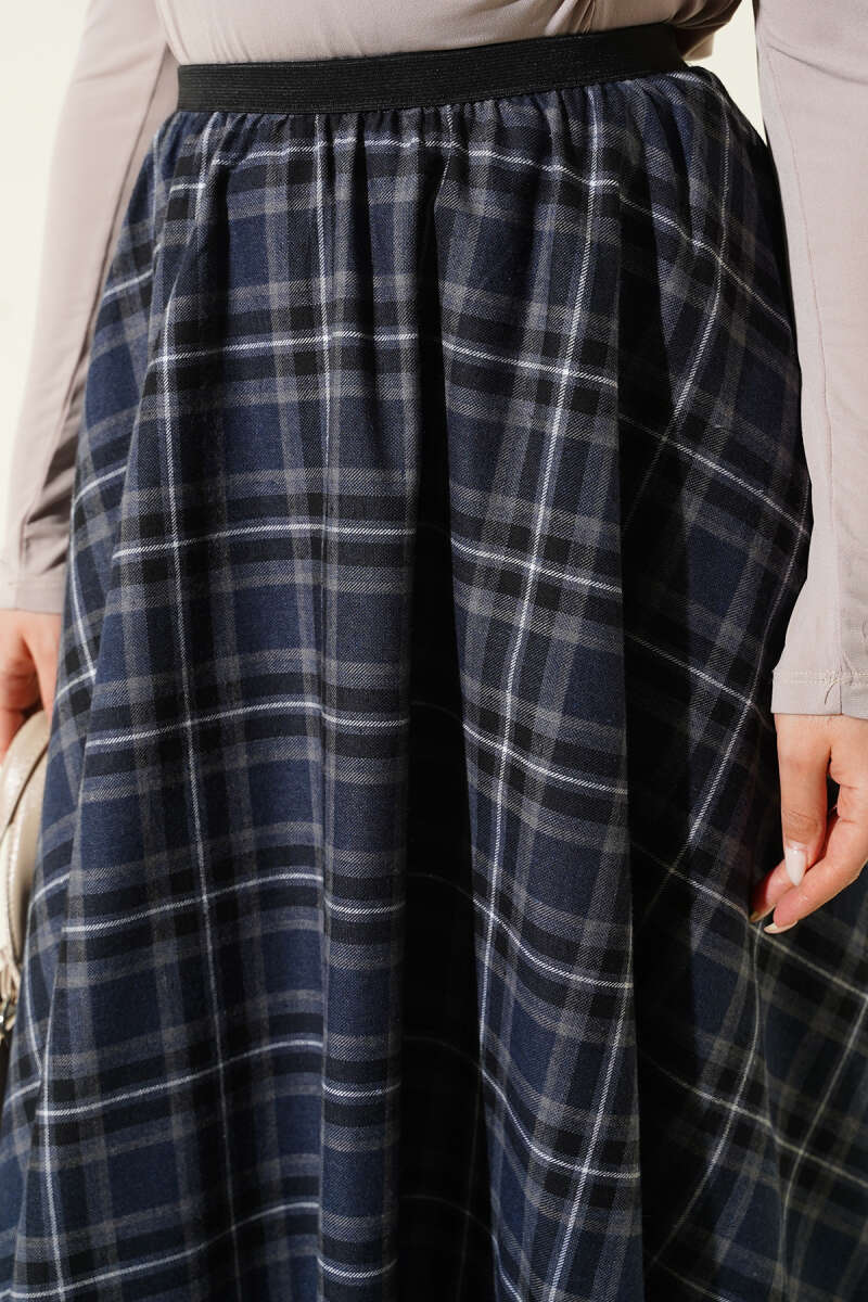 Beli Lastikli Ekose Desen Kloş Etek İndigo