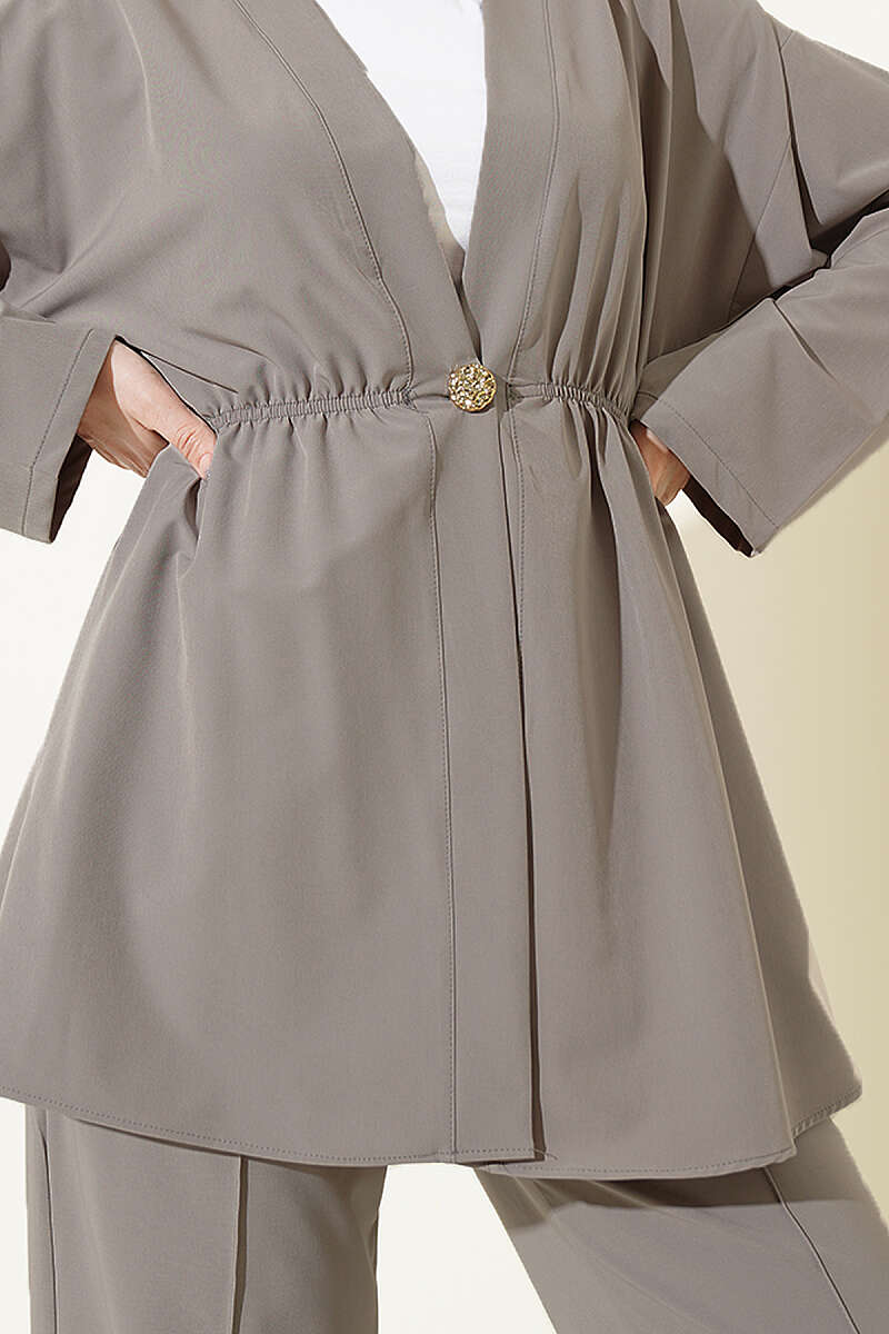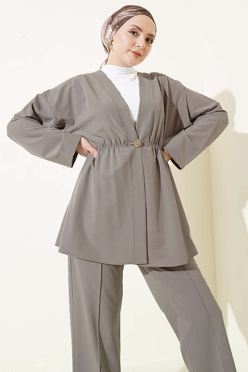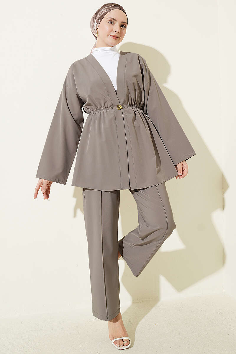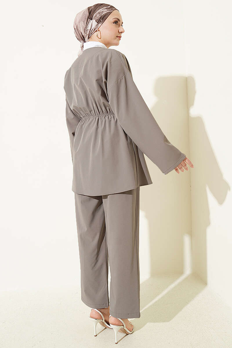 Modern ve sofistike bir duruş sergileyen bu ikili takım, bel kısmındaki büzgü detayı ve altın renkli tek düğme kapanışıyla silüetinizi zarifçe vurguluyor. V yaka kesimi ve dökümlü geniş kol yapısı, tasarıma hem ferah hem de şık bir hava katarken, boru paça pantolonun dikey dikiş izleri bacak boyunu daha uzun gösteren bir form sunuyor.