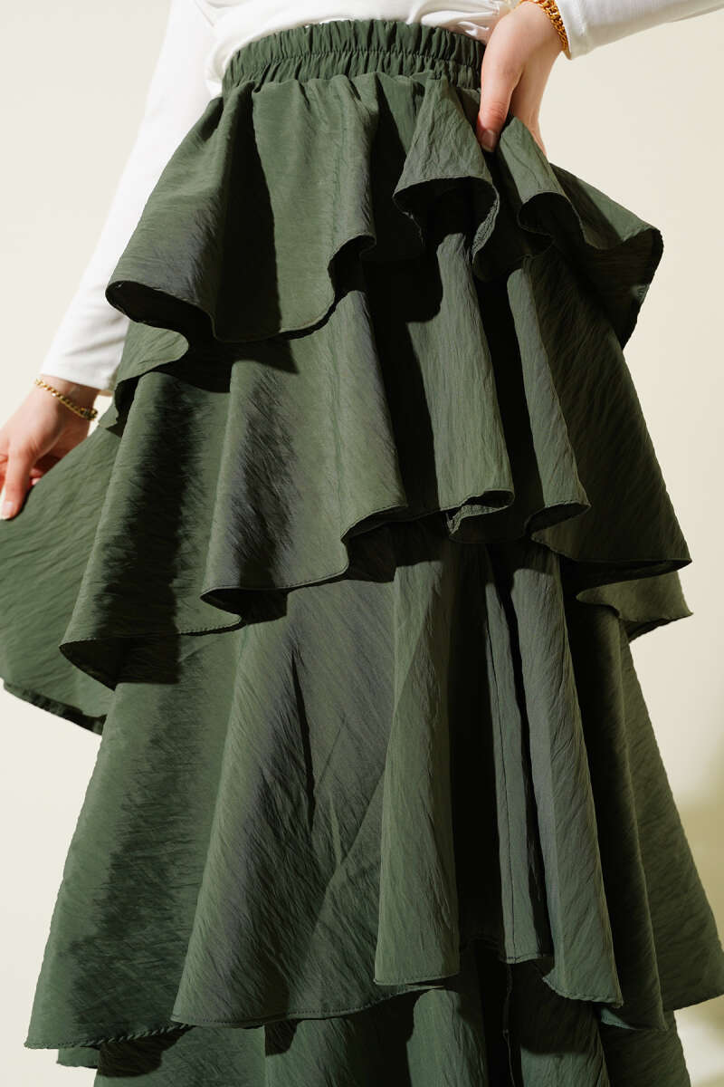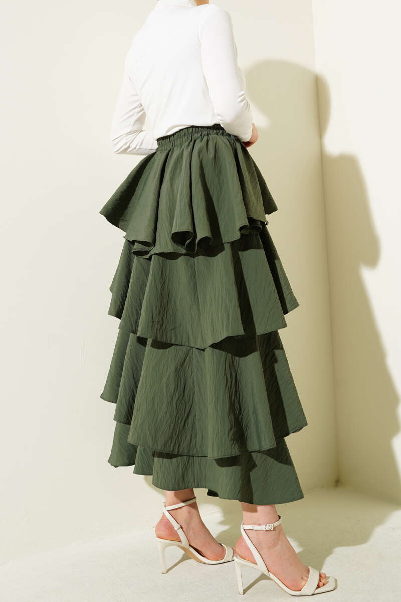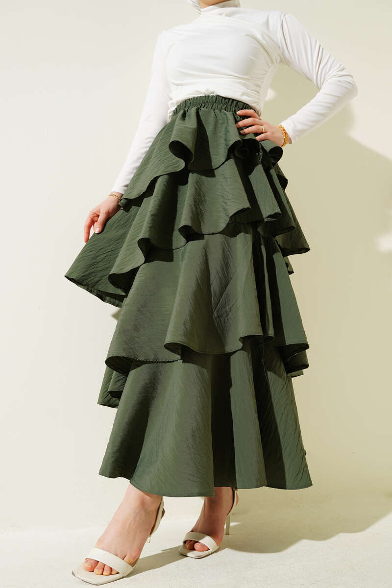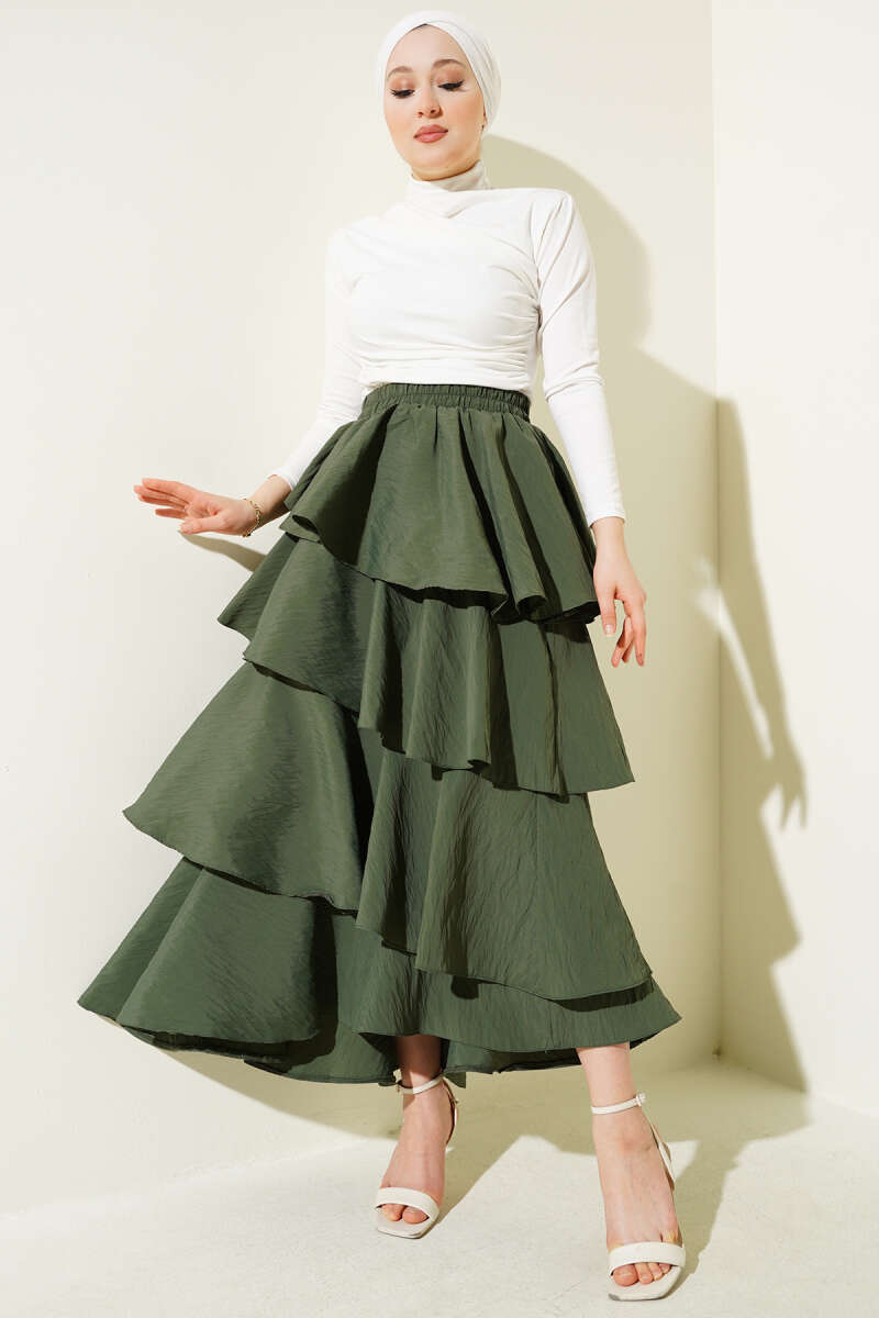 Kemer Aksesuarlı Ekoseli Etek Haki