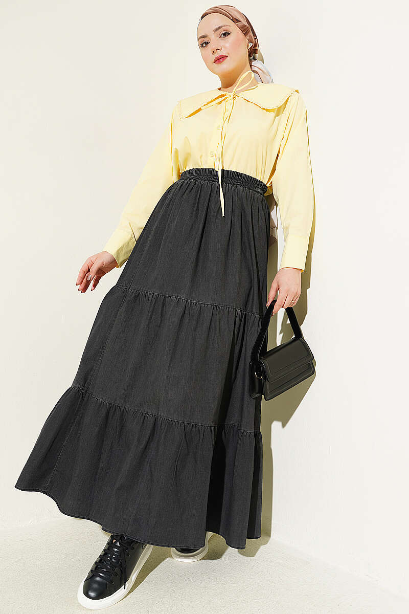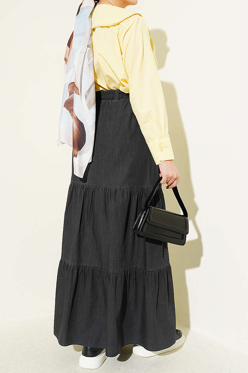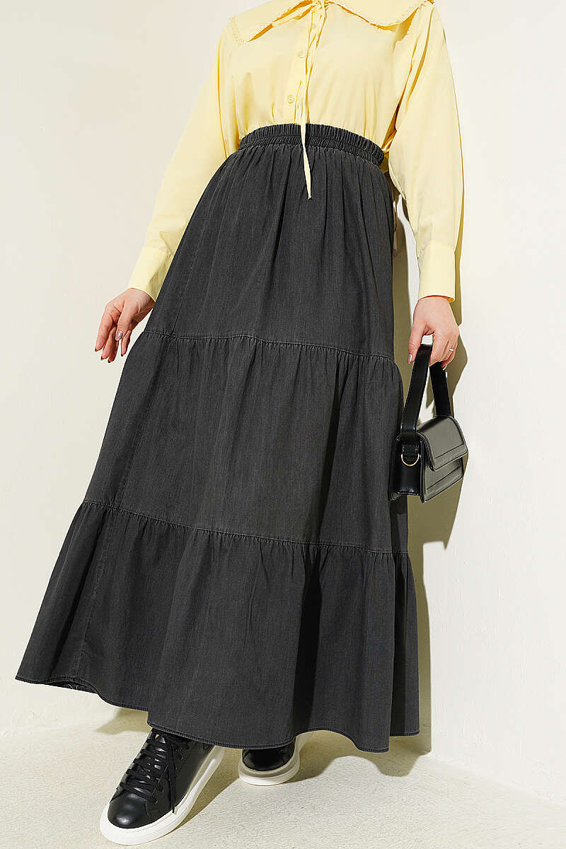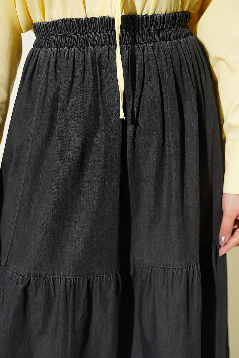 Beli Lastikli Katlı Kot Etek Antrasit