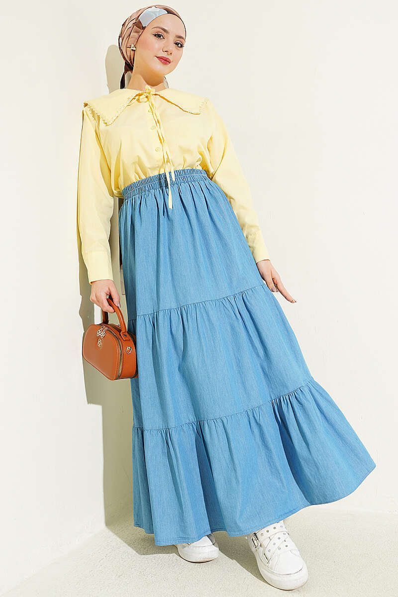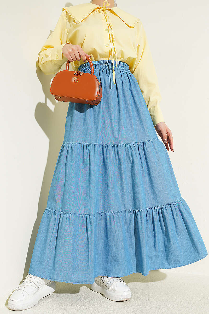 Bu etek, modern ve konforlu tasarımıyla günlük kombinlerin vazgeçilmez bir parçası olmaya aday, zamansız bir parçadır. Beli lastikli yapısı sayesinde gün boyu hareket özgürlüğü ve rahat bir kullanım sunarken, farklı vücut tiplerine de kolayca uyum sağlar. Eteğin hareketli ve hacimli görünümünü destekleyen katlı kesim detayları, tasarıma bohem ve dinamik bir hava katar. Hafif ve dayanıklı kot kumaşıyla hem spor ayakkabılarla hem de şık sandaletlerle rahatlıkla eşleştirilebilir.
