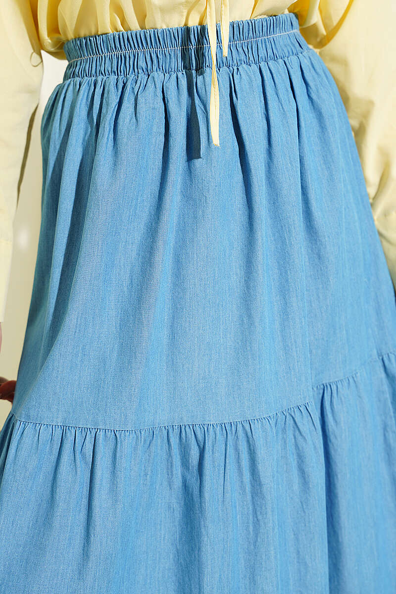 Beli Lastikli Katlı Kot Etek Kot Mavisi
