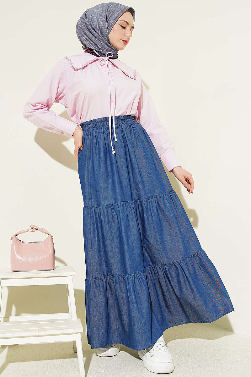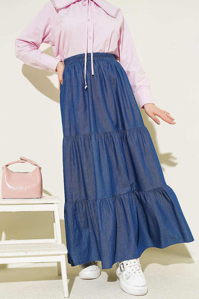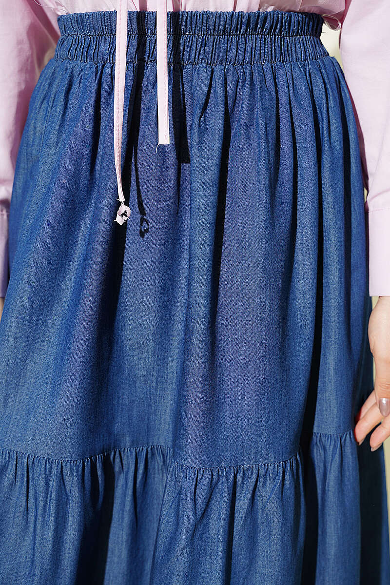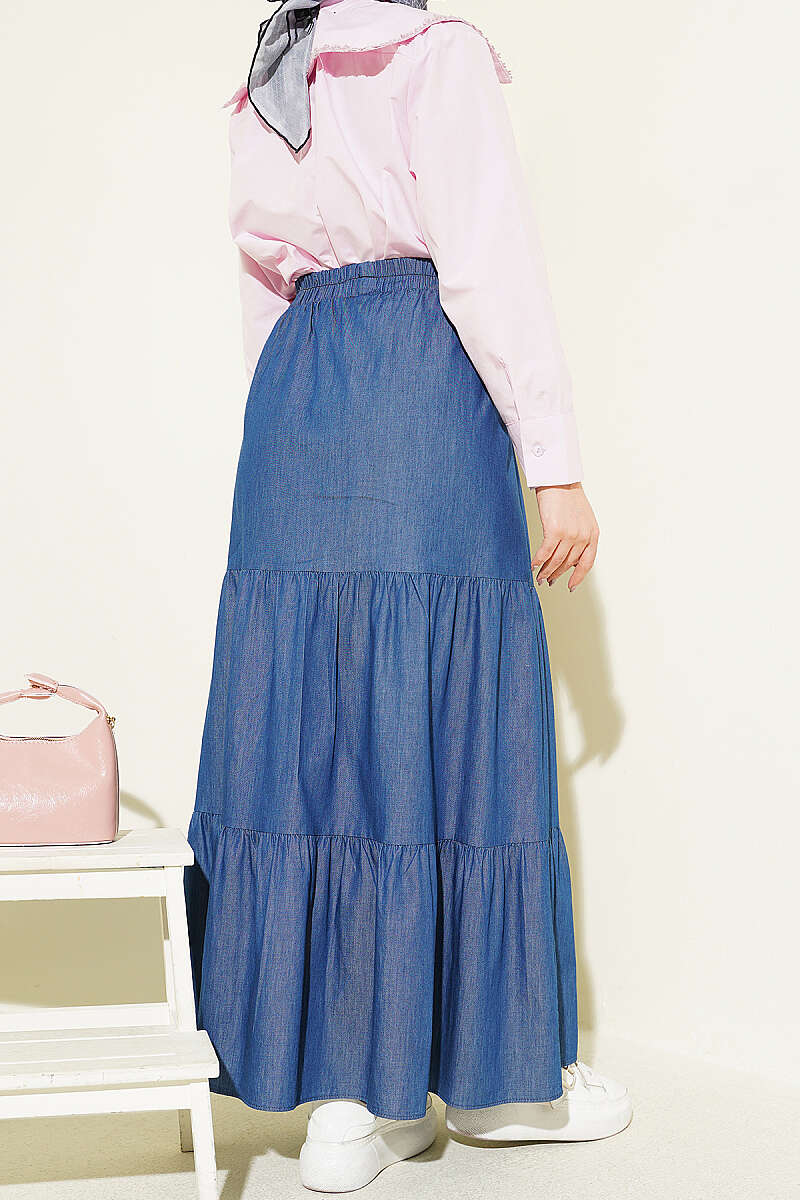 Beli Lastikli Katlı Kot Etek Kot Mavisi
