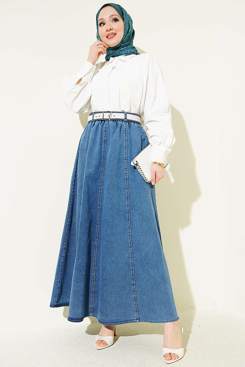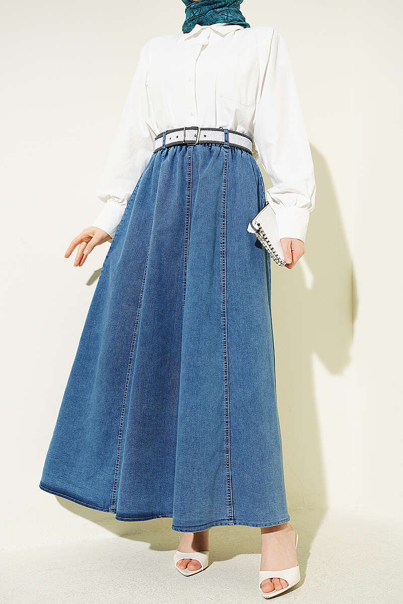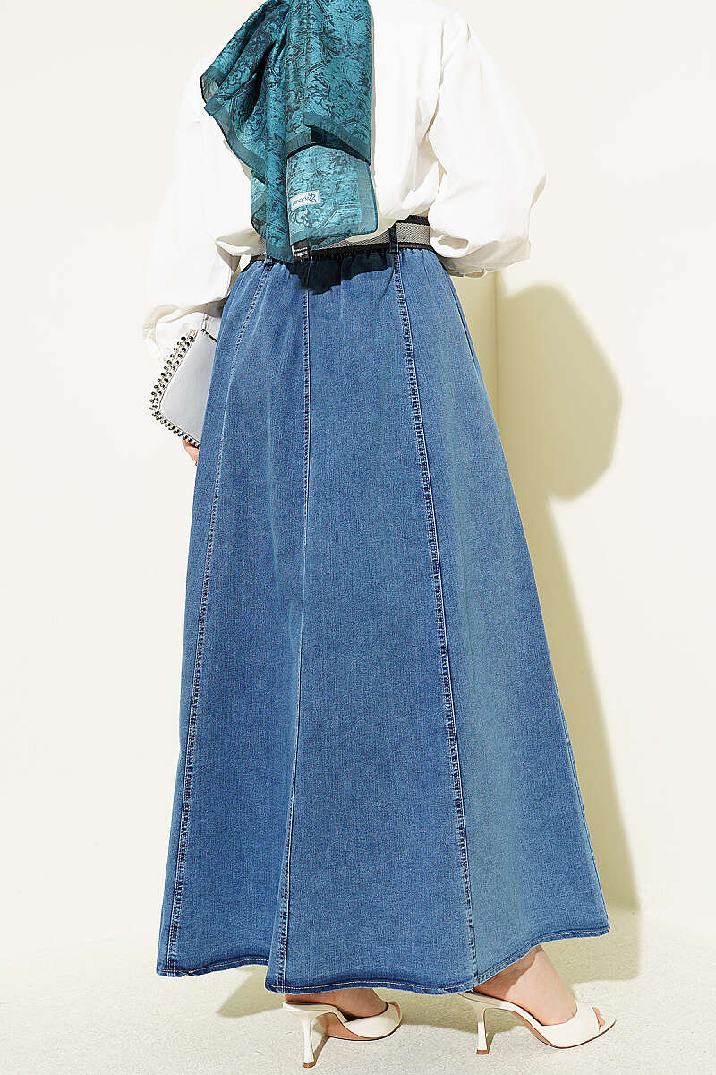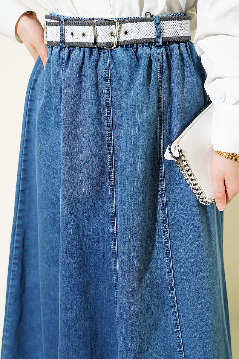 Beli Lastikli Kemerli Kloş Kot Etek Kot