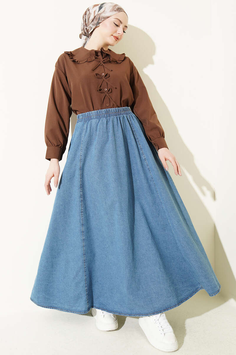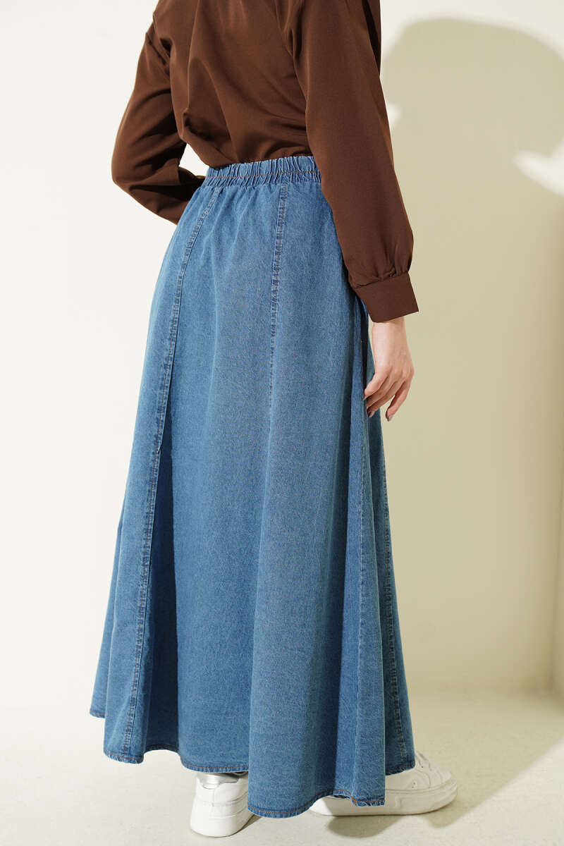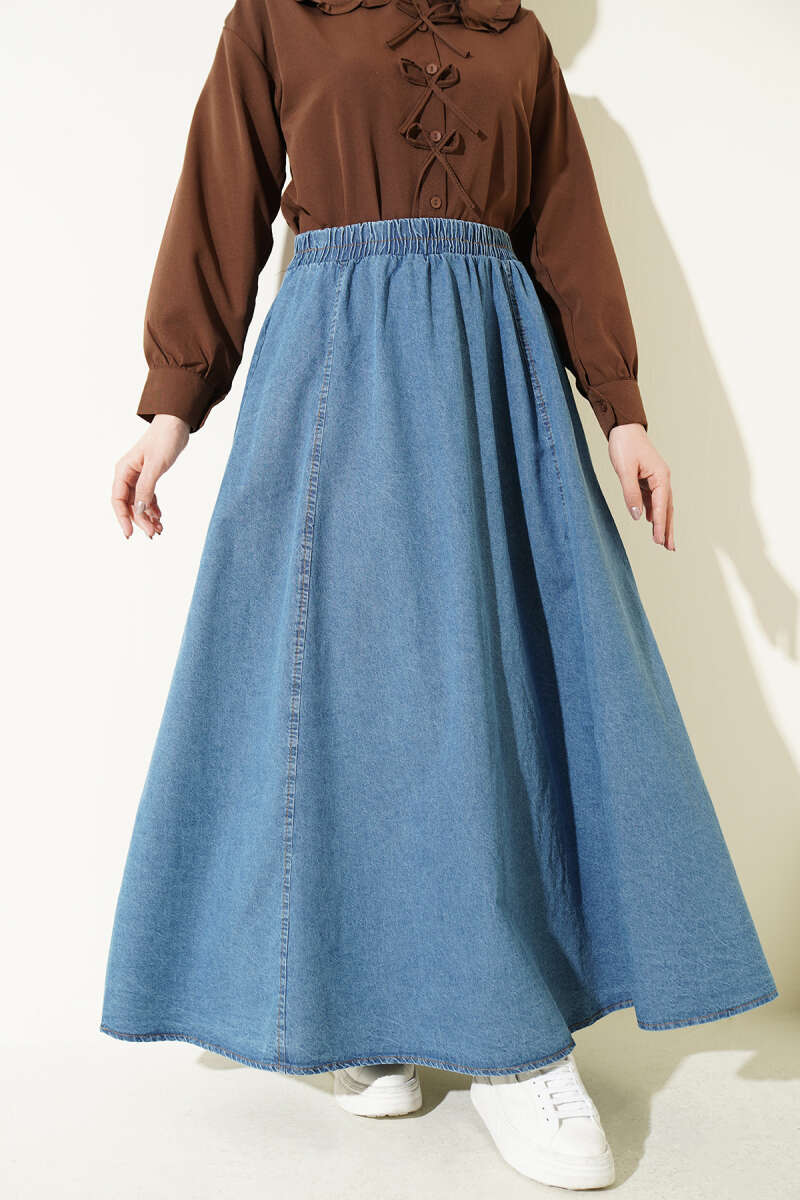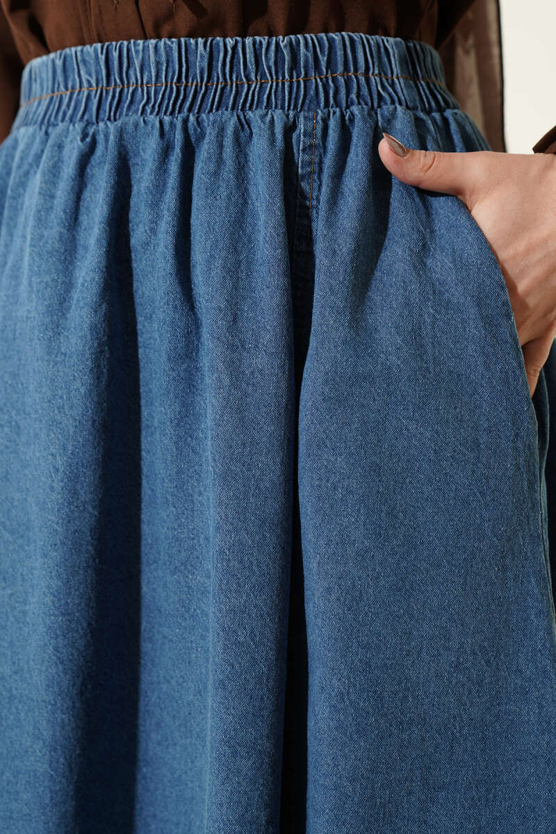 Beli Lastikli Kloş Kot Etek Açık Mavi