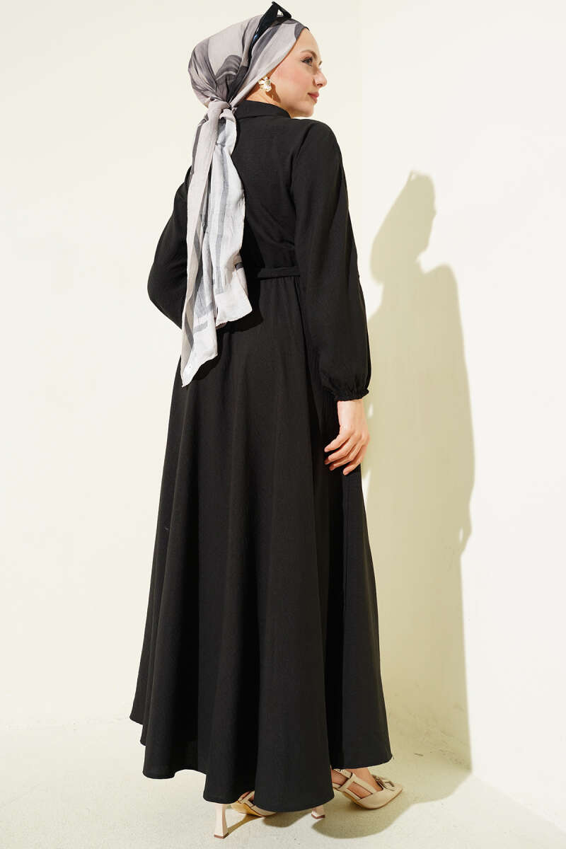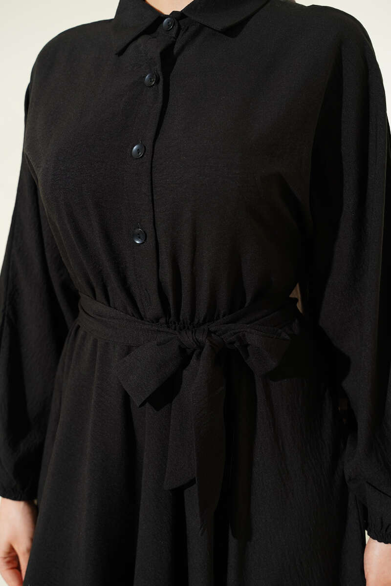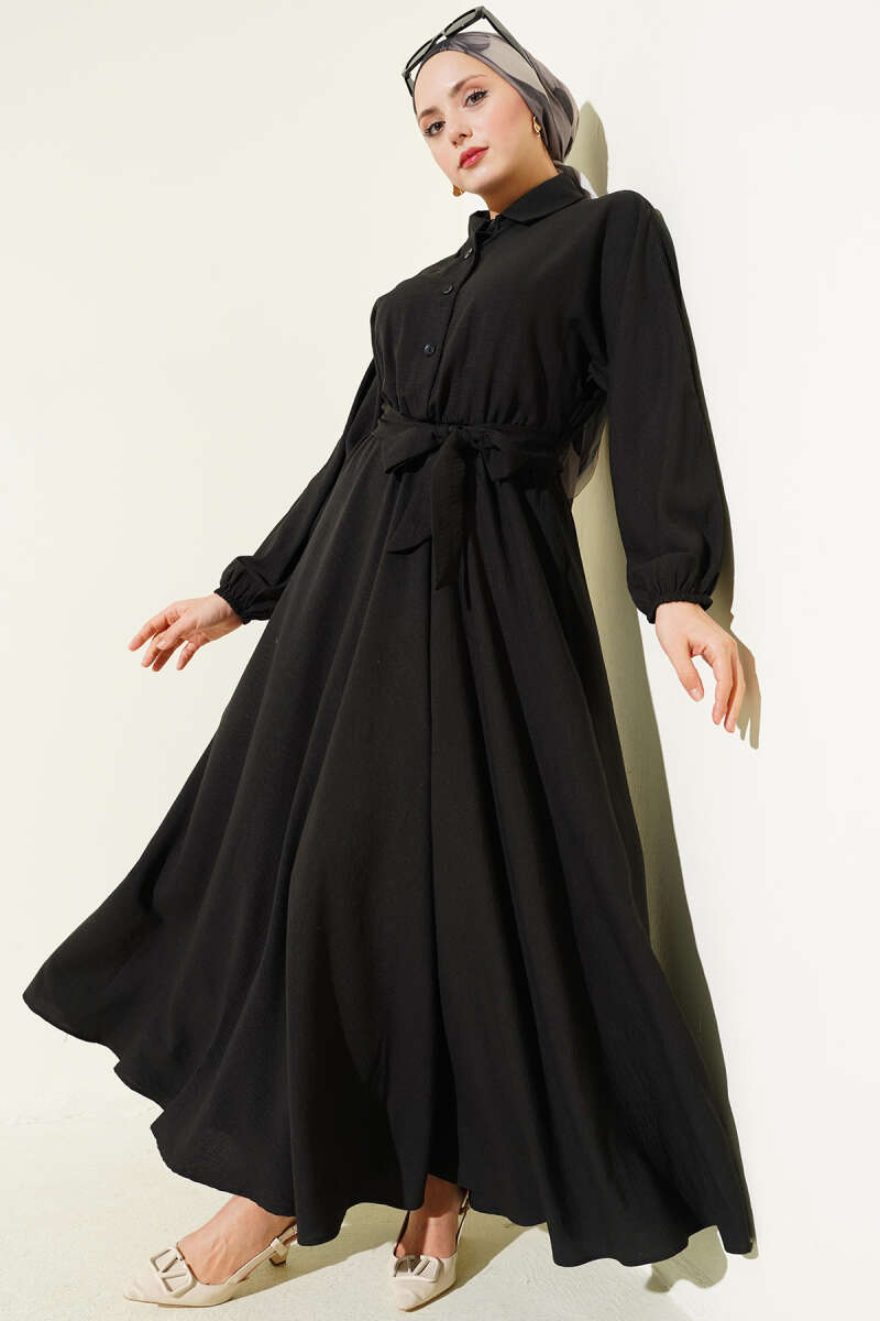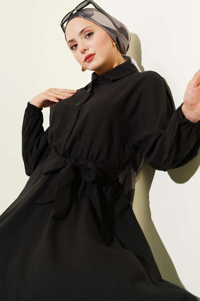 Beli Lastikli Kuşaklı Elbise Siyah