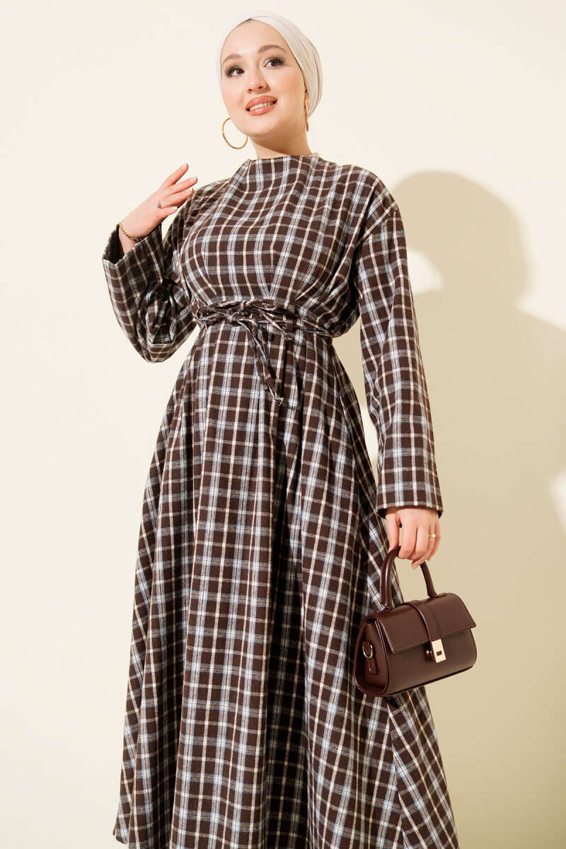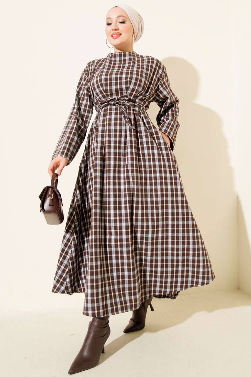 Beli Pens Detaylı Ekoseli Elbise Kestane
