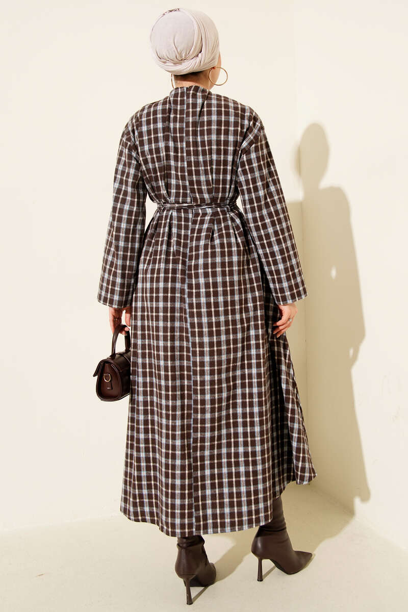 Boydan Düğmeli Ekoseli Kemerli Elbise Kahve