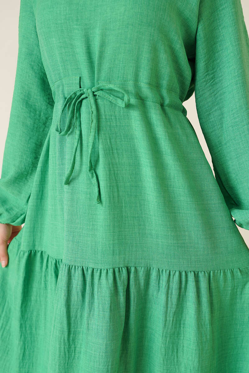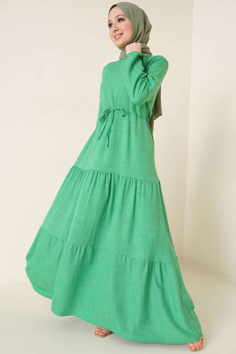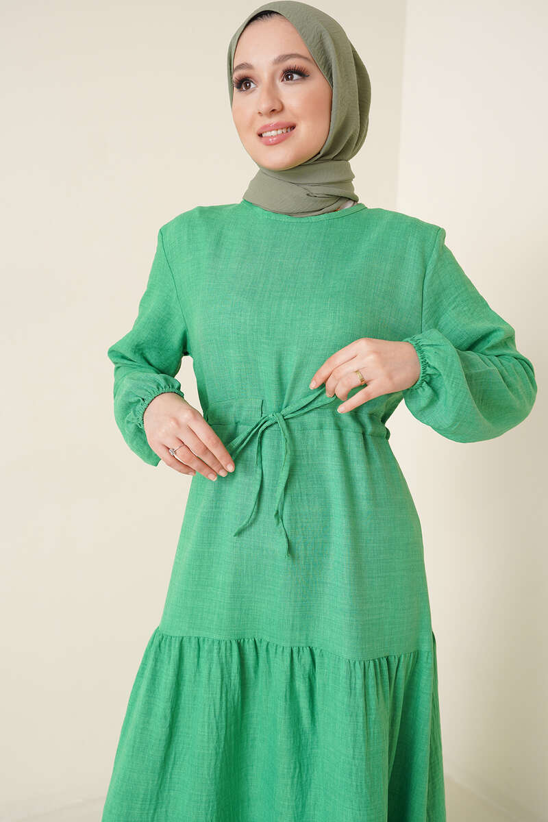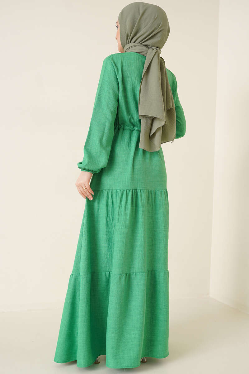 Yeni sezon elbisemizin beli tünel bağlamalıdır. Kat kat model olan elbisemizin bilekleri lastiklidir. Ense düğmesi bulunan elbisemiz rahatlığı şıklıkla birleştirmek isteyenler için ilk tercih olmaya adaydır.