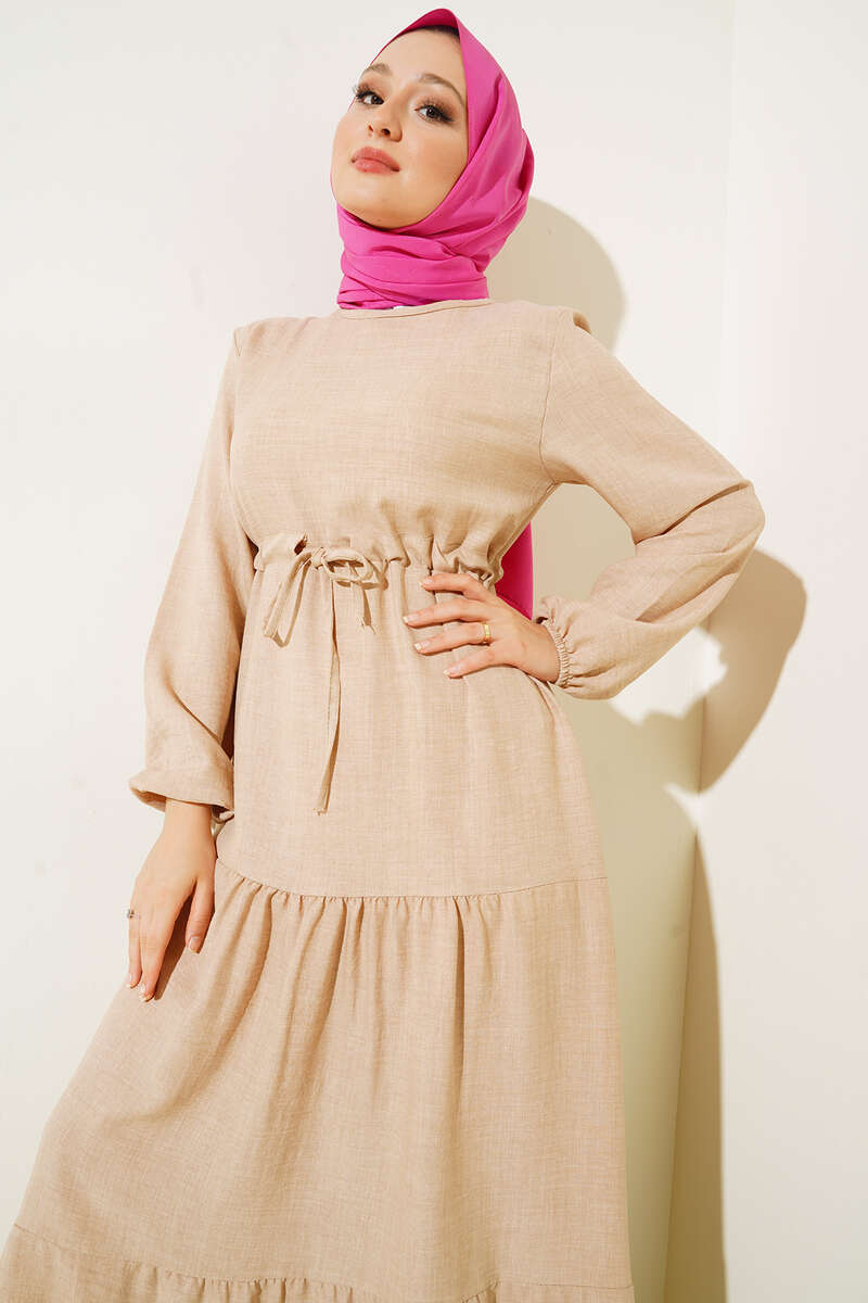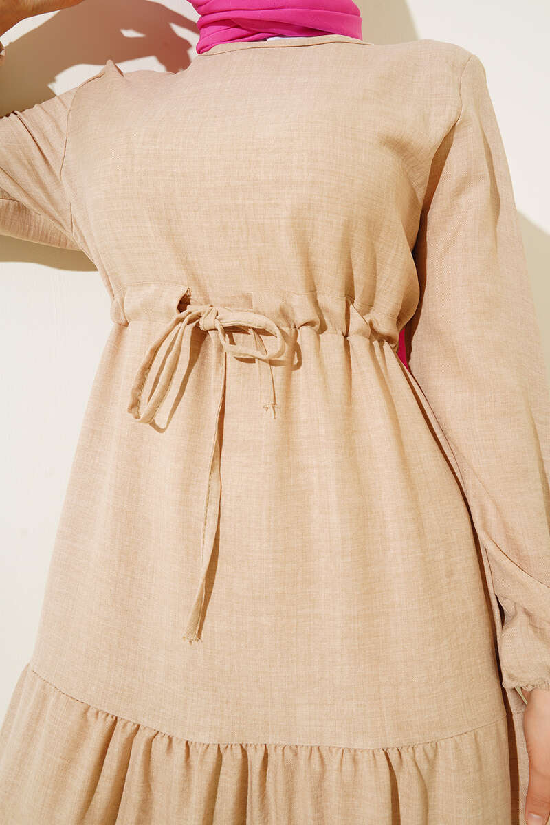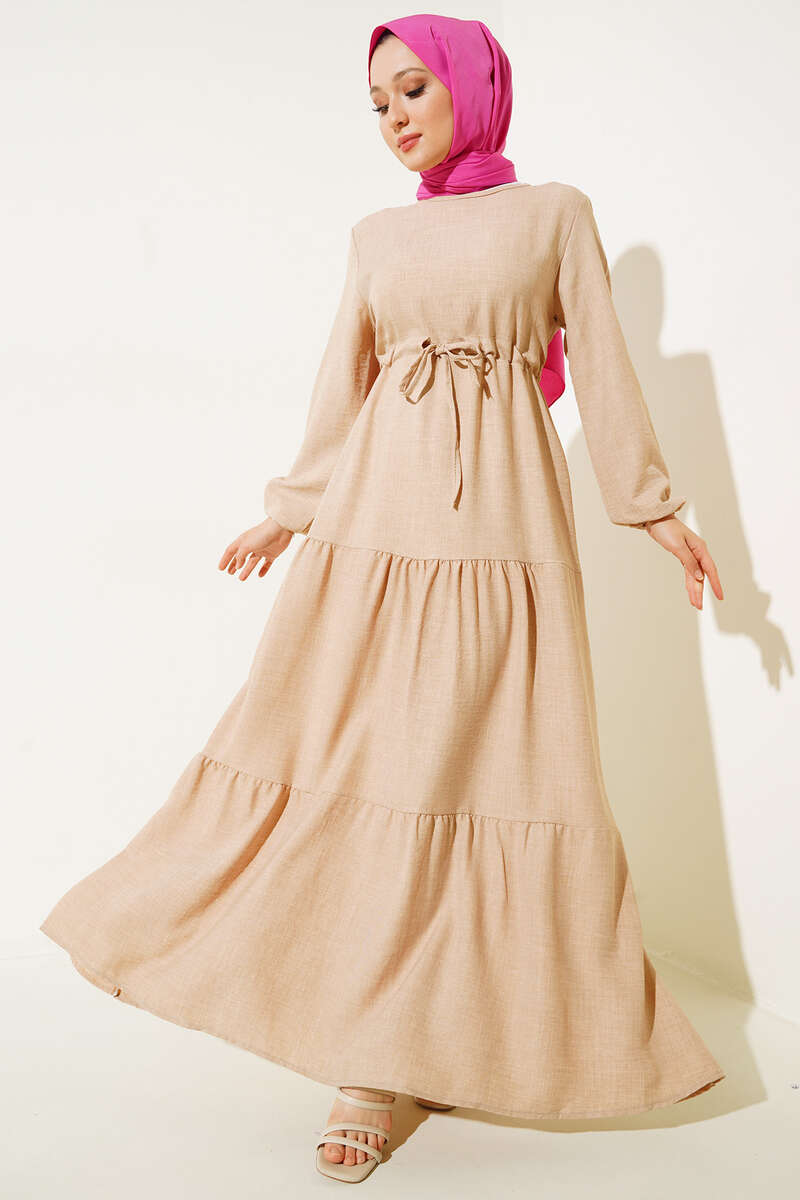 Yeni sezon elbisemizin beli tünel bağlamalıdır. Kat kat model olan elbisemizin bilekleri lastiklidir. Ense düğmesi bulunan elbisemiz rahatlığı şıklıkla birleştirmek isteyenler için ilk tercih olmaya adaydır.