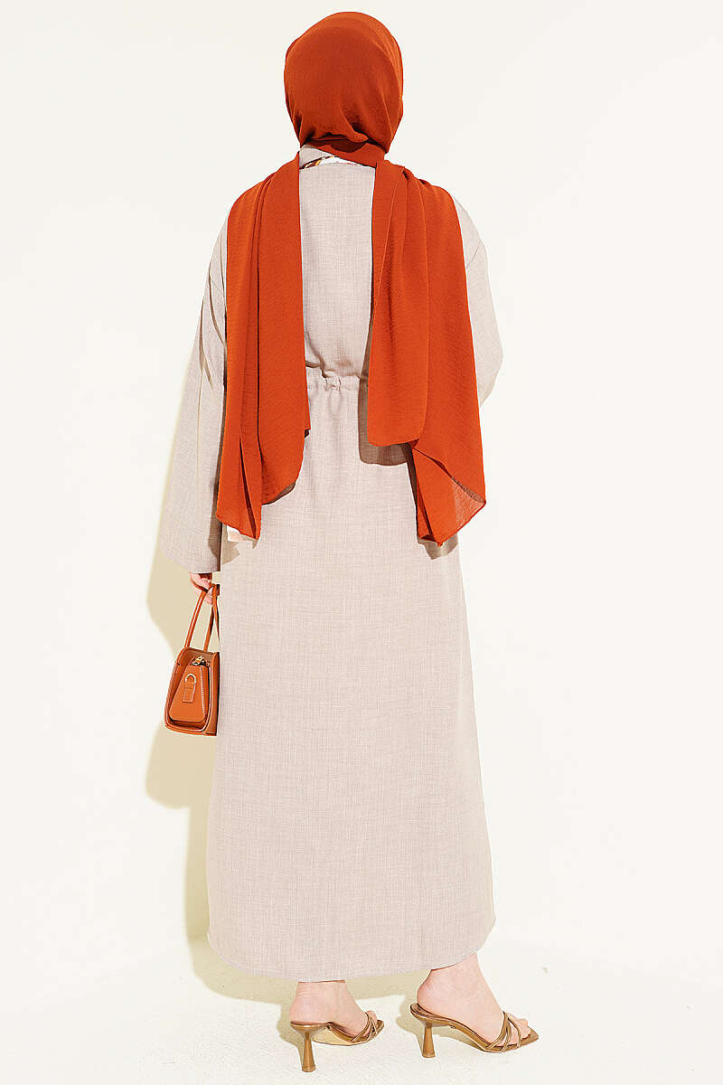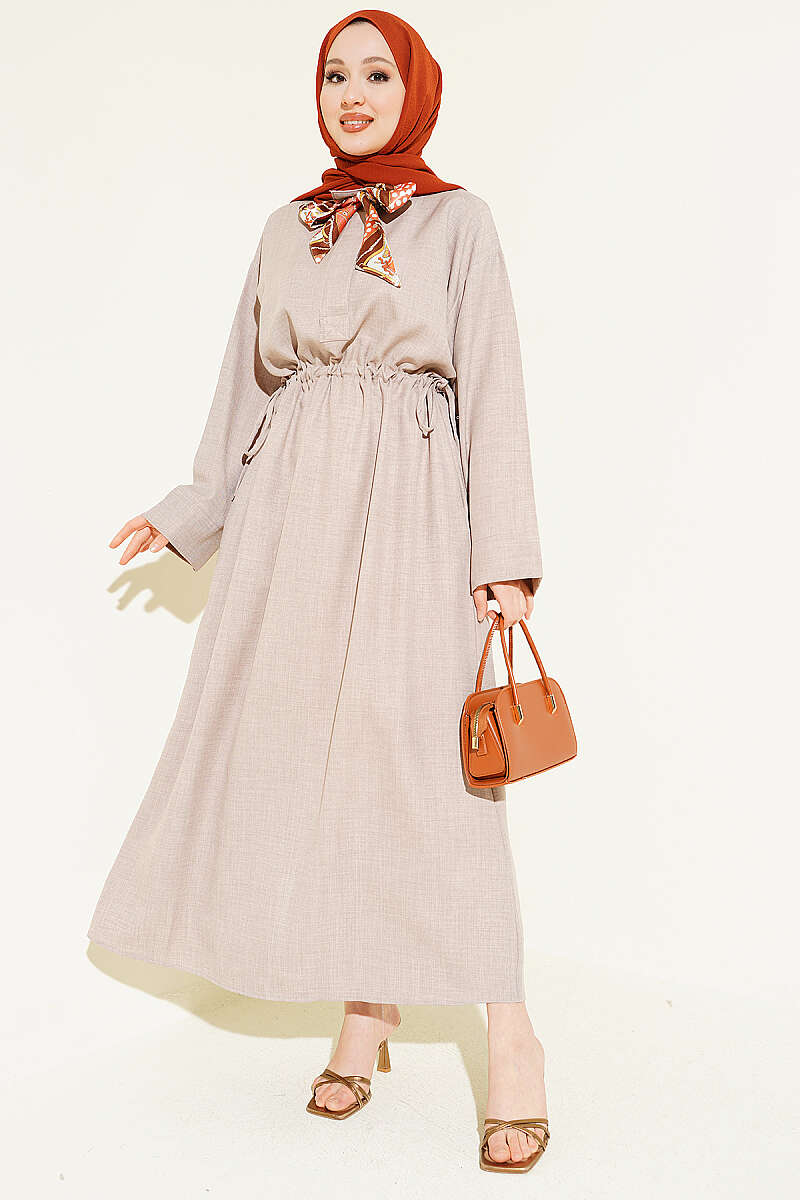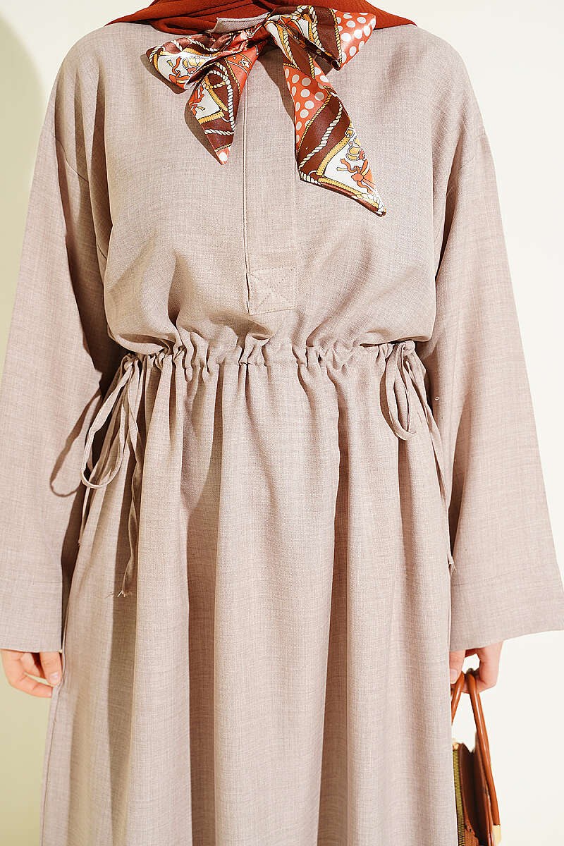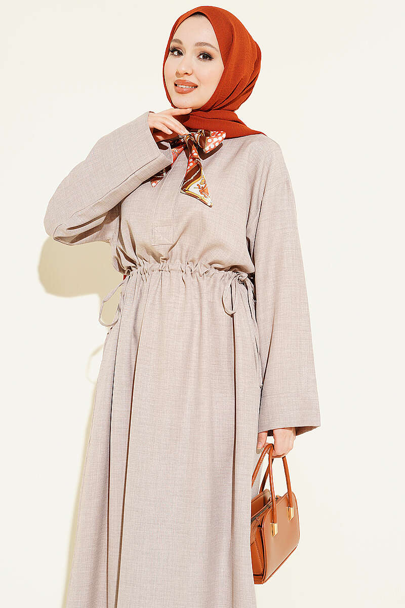 Beli Tünelli Bağlamalı Fularlı Elbise Vizon