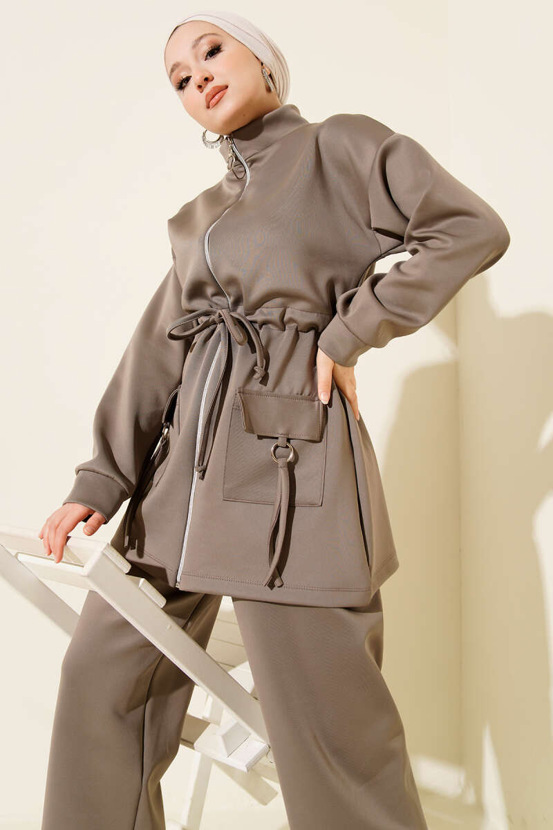 Taşlı Yaka Fermuarlı Scuba İkili Takım Ekru