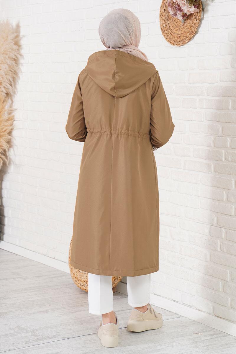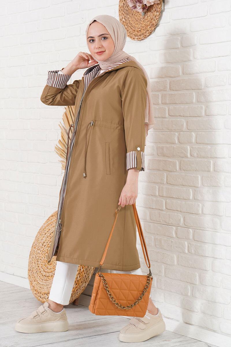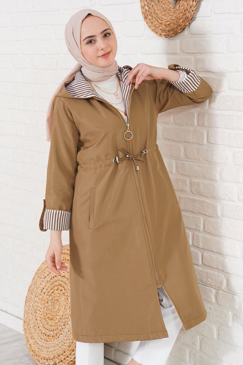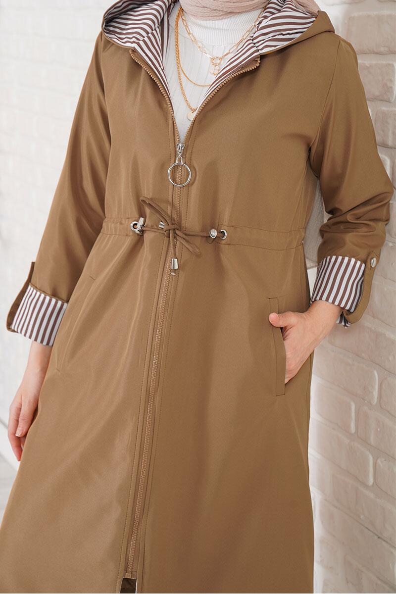 Harika bir trençkot modeli ile sizlerleyiz. İçi astarlı trençkot kış aylarında da tercih edilebilir. Kapüşonlu olan modelin kol kısmı katlanabilir detaylıdır. Kol ve kapüşon astarı çizgili olduğundan hareketli bir görünüme eşlik etmiştir. Cepleri olan trençkot boydan fermuarlıdır.