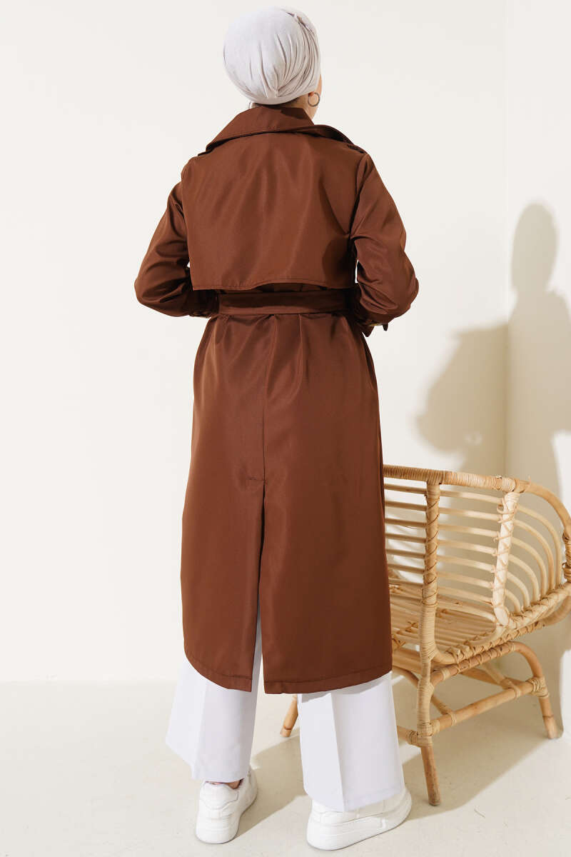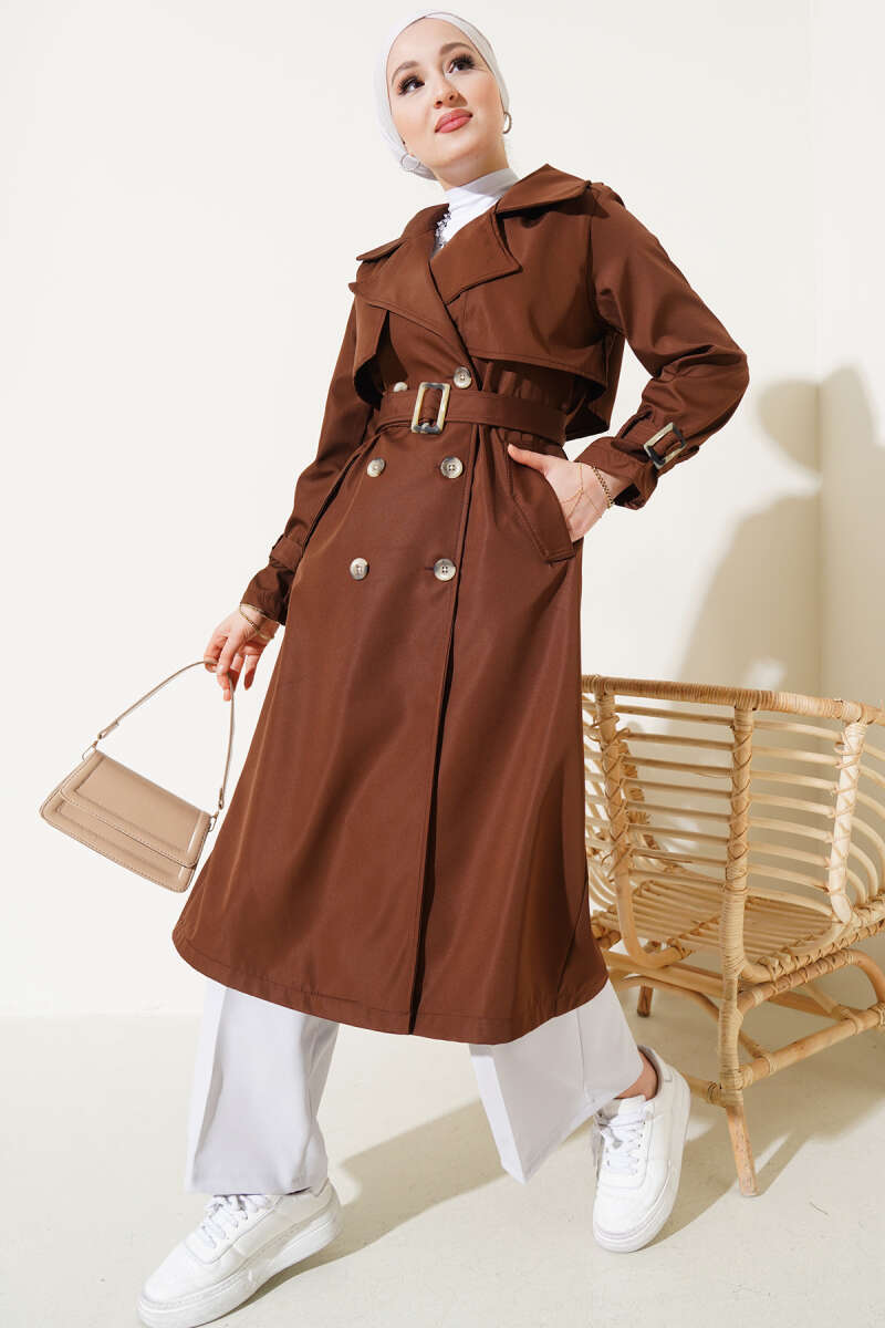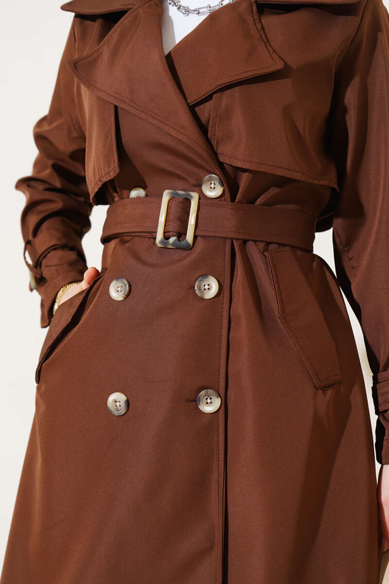 Bileği Kuşaklı Düğmeli Trençkot Kahve