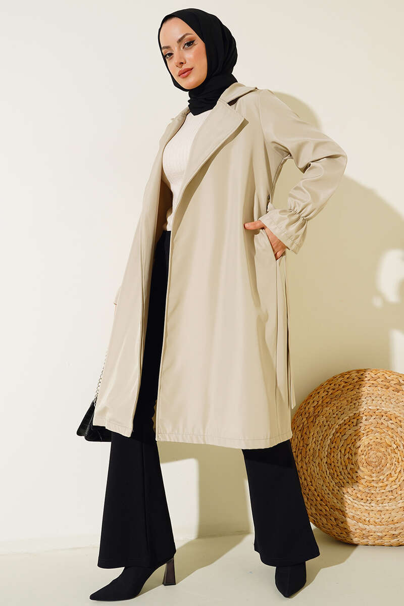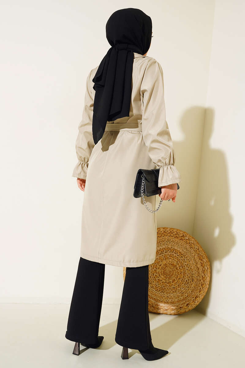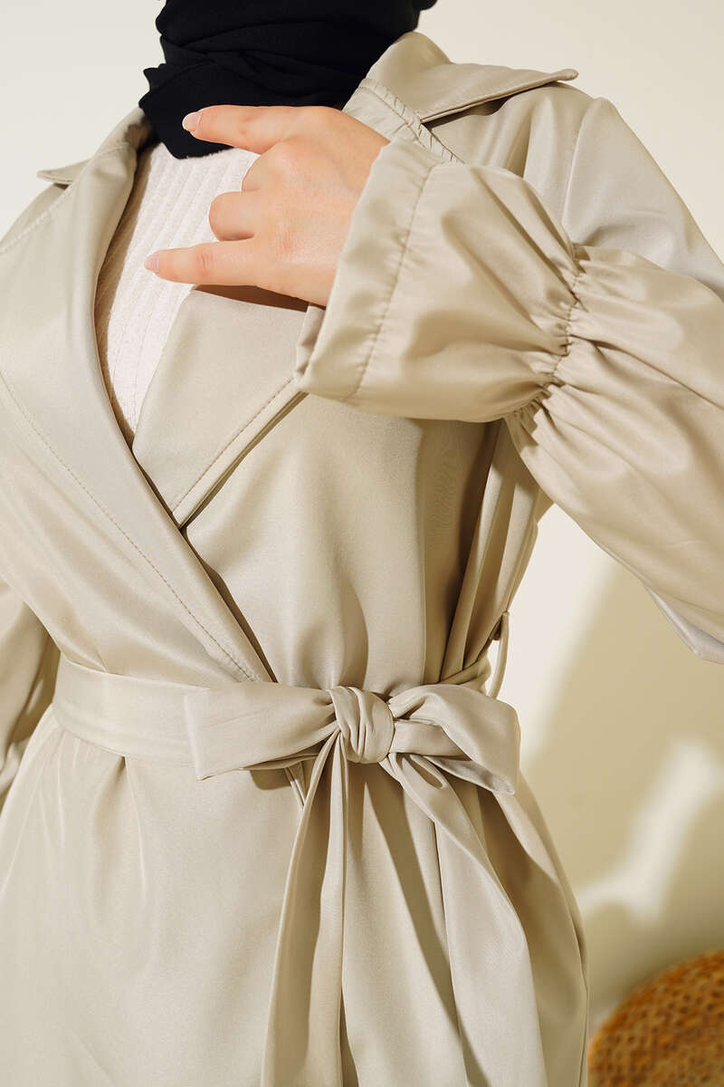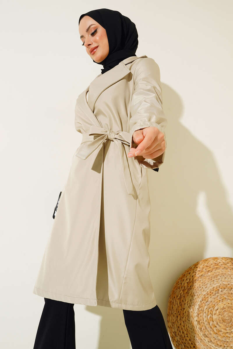 Klas duruşuyla dikkat çeken yeni sezon uzun trençkot sizlerle... Düğmesiz model olan trençkot şal yakalıdır. Esnek büzgü kolludur. İki adet kemer köprüsü ve iki adet cebi bulunmaktadır. Kendi kumaşından kuşak trençkota aittir. Astarsız olan trençkot iç göstermemektedir.