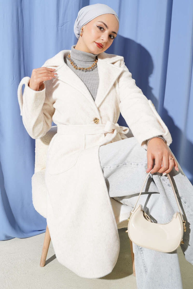 Bilek Apoletli Kuşaklı Tay Tüyü Kaban Bej