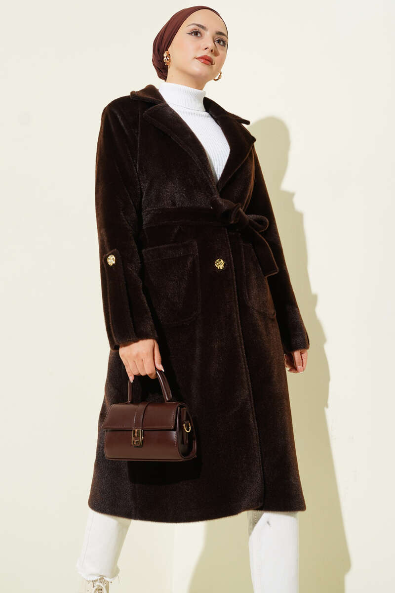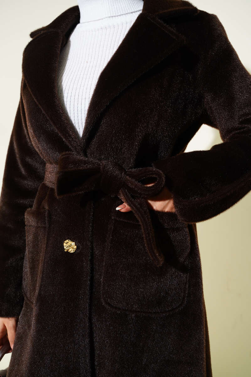 Kuşaklı Gold Düğmeli Kaşe Kaban Taba