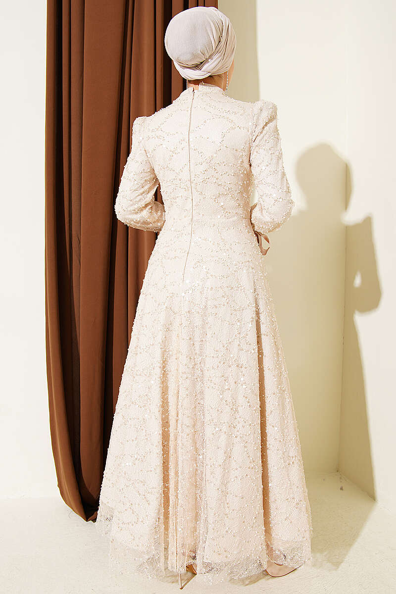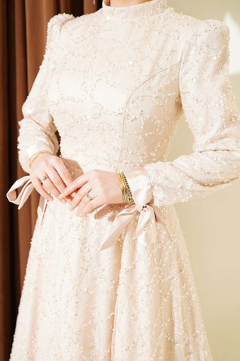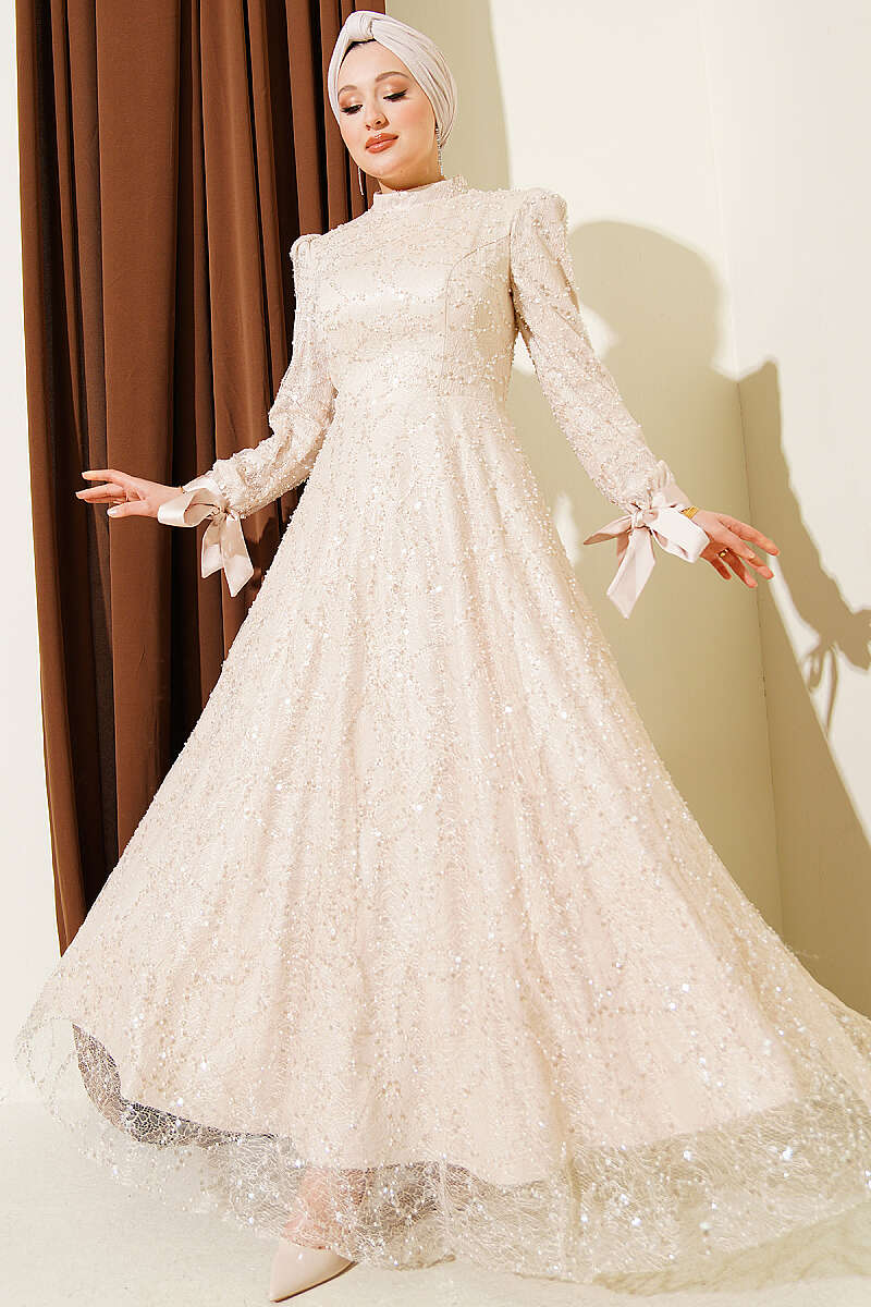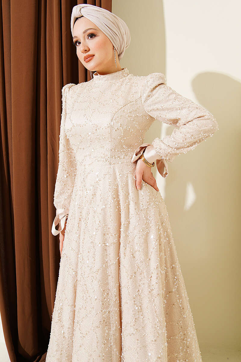 Bilek Bağcıklı Pullu Taşlı Abiye Elbise Bej