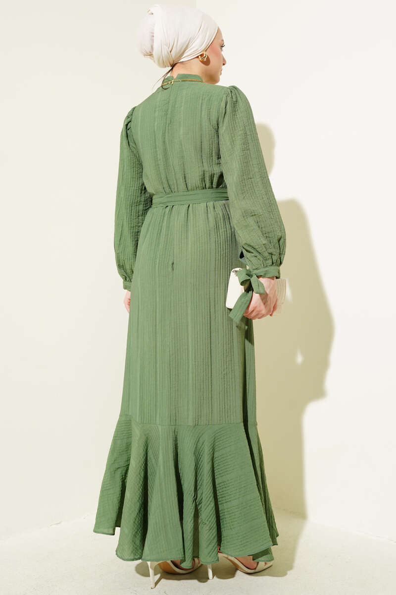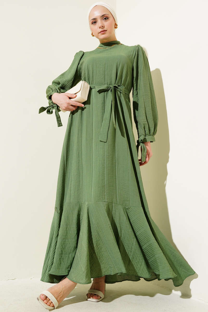 Pelerinli İp Bağcıklı Elbise Haki