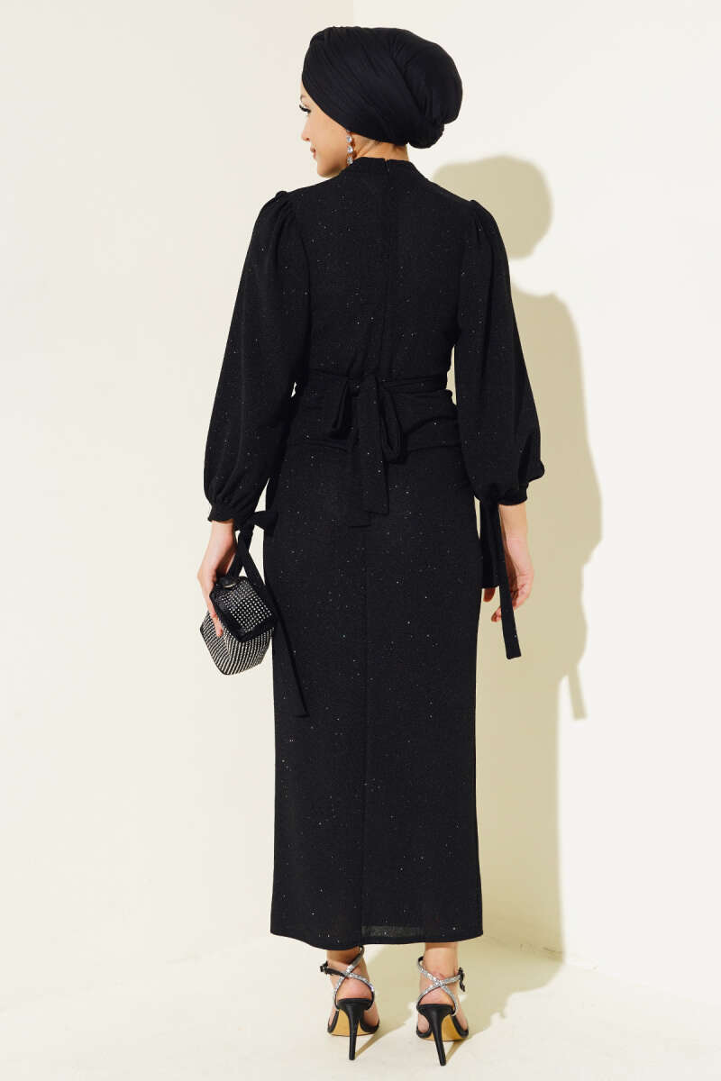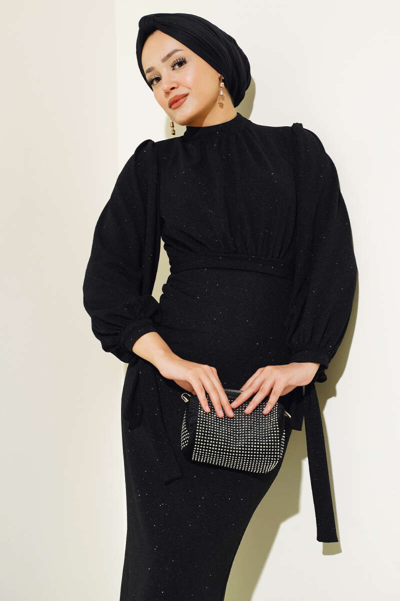 Bel Büzgü Detaylı Abiye Elbise Siyah