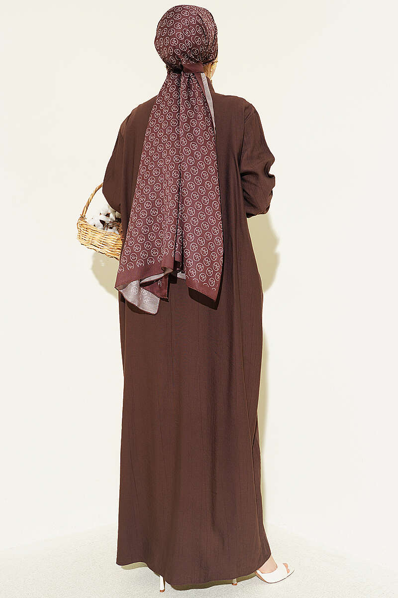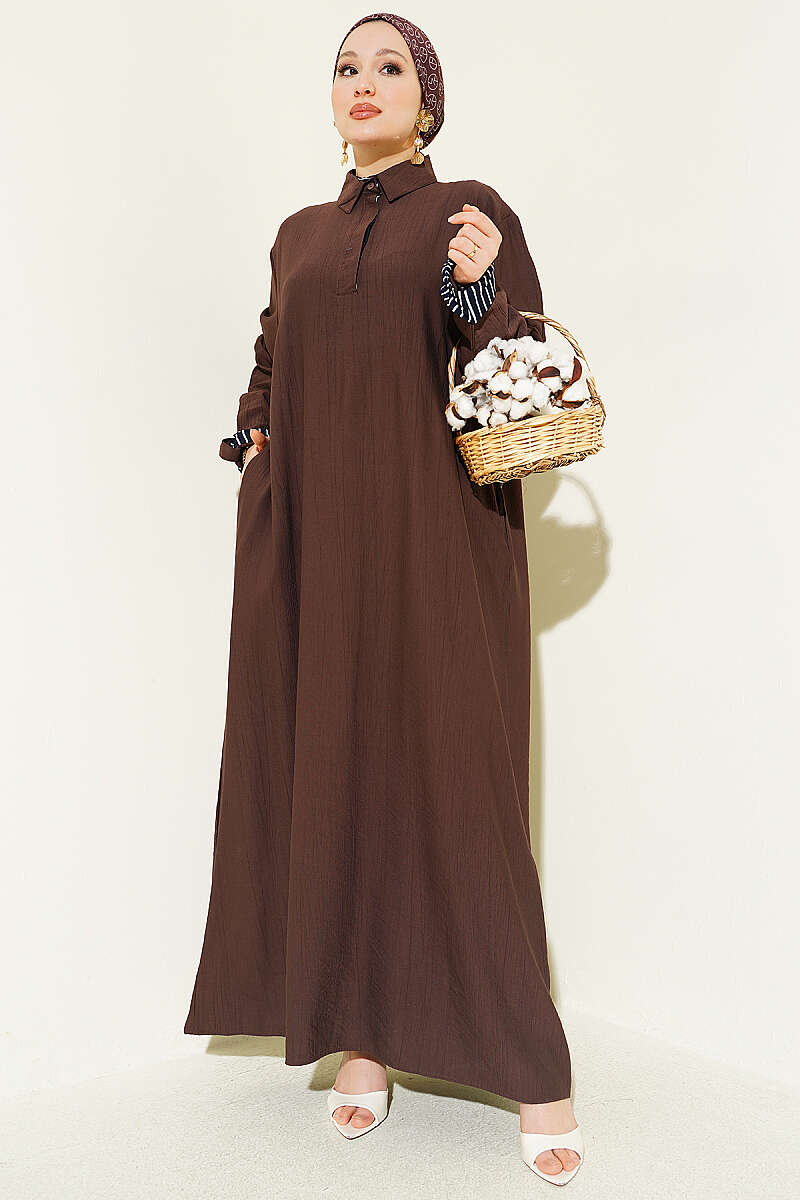 Bilek Çizgili Yarım Düğmeli Elbise Kahve
