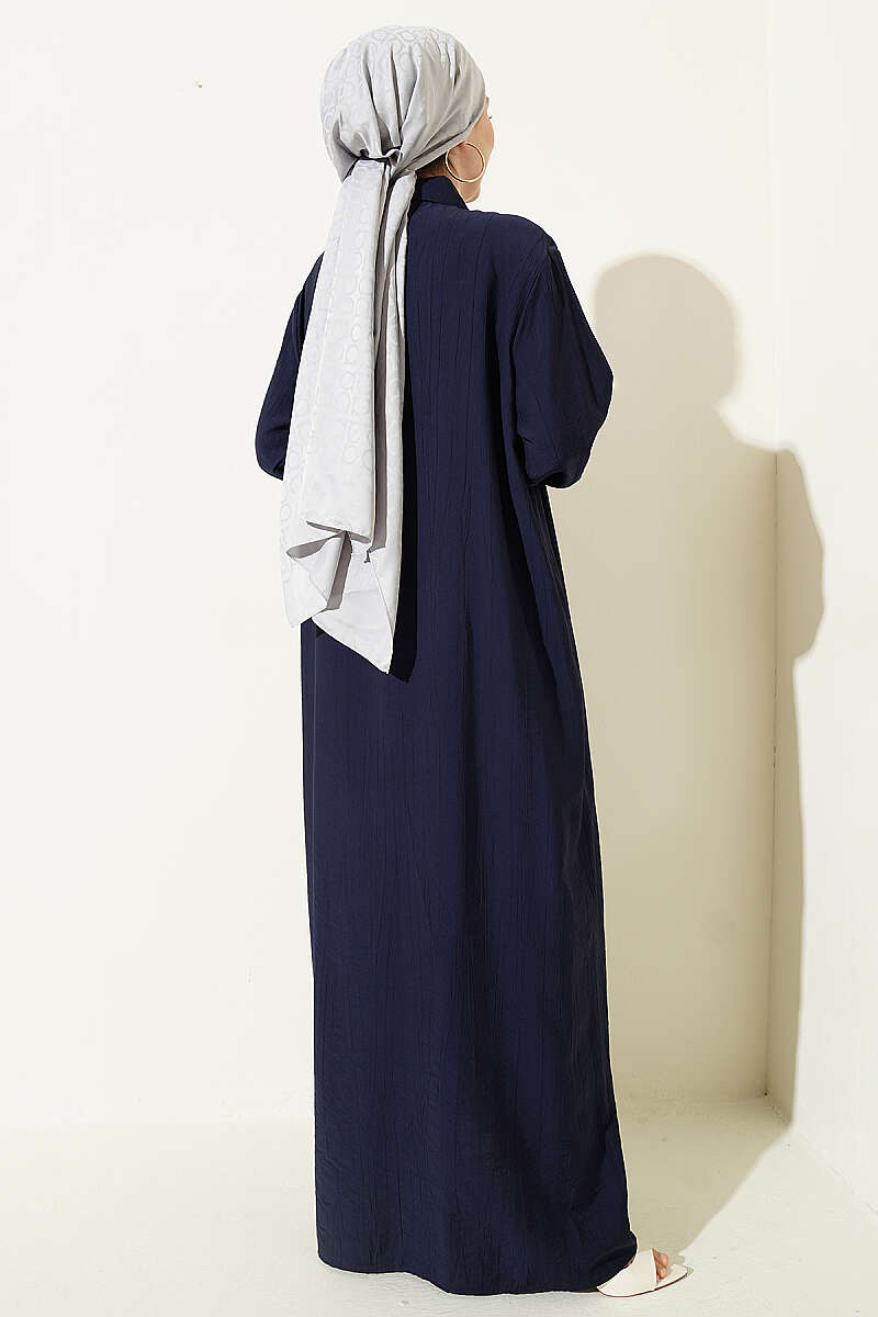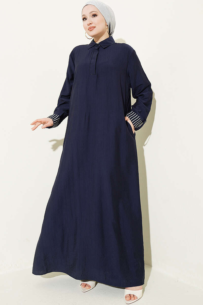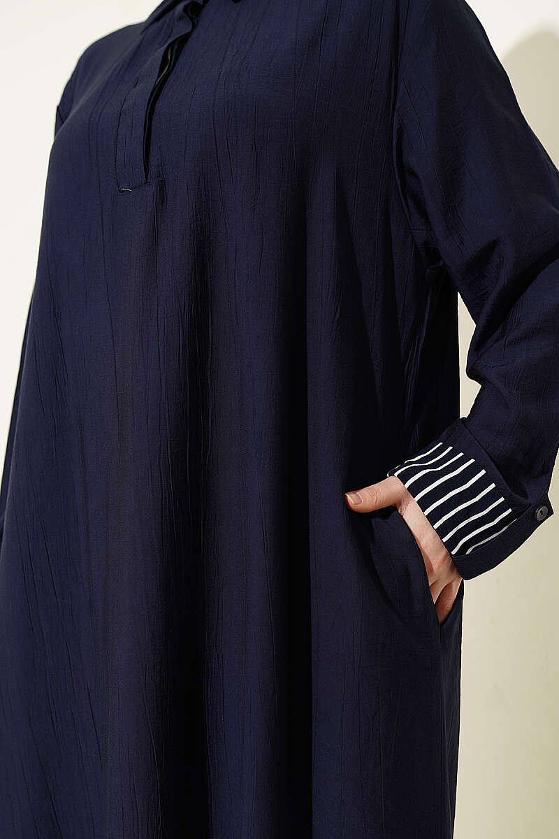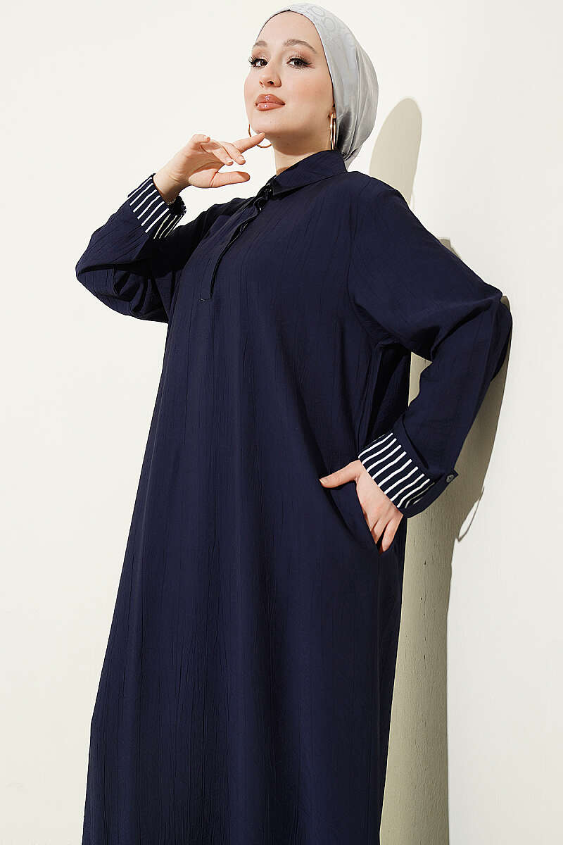 Bilek Çizgili Yarım Düğmeli Elbise Koyu Lacivert