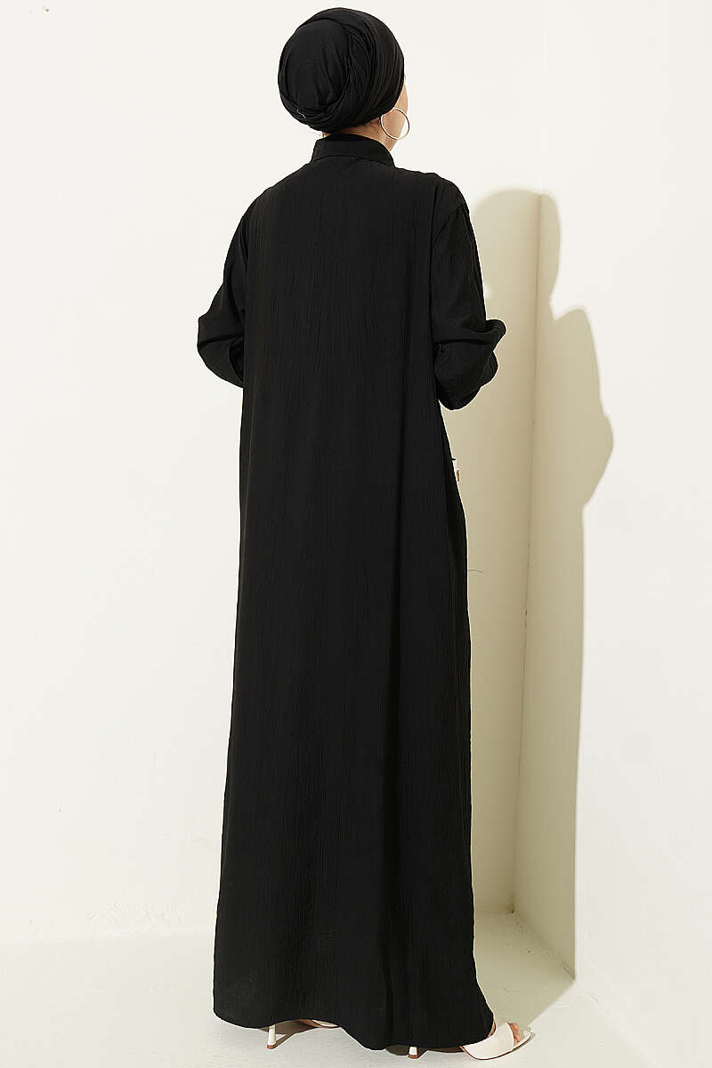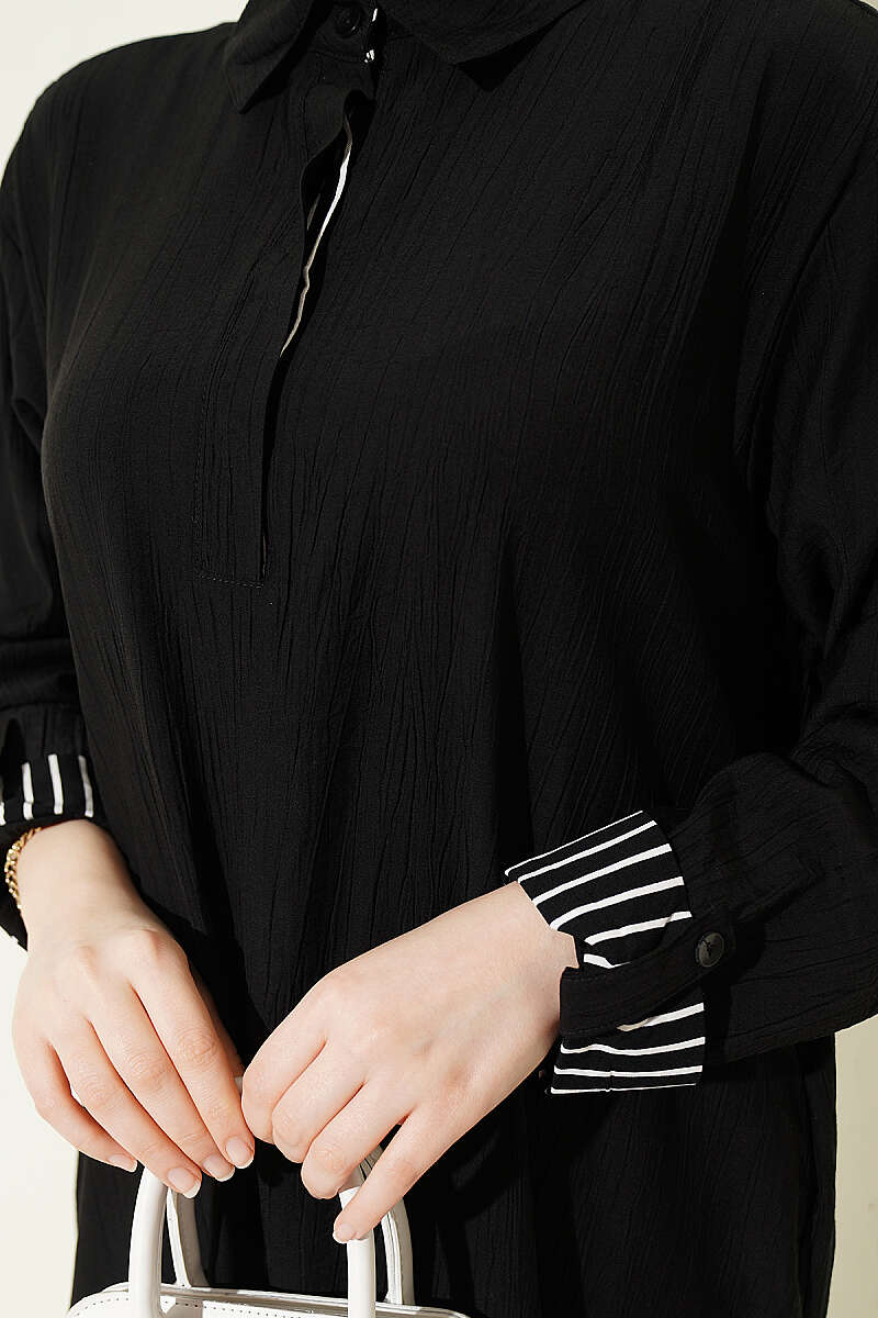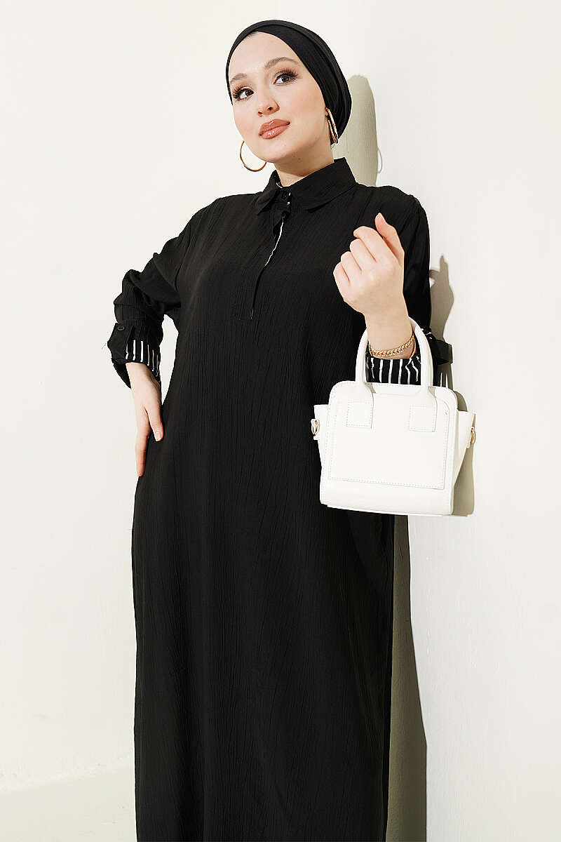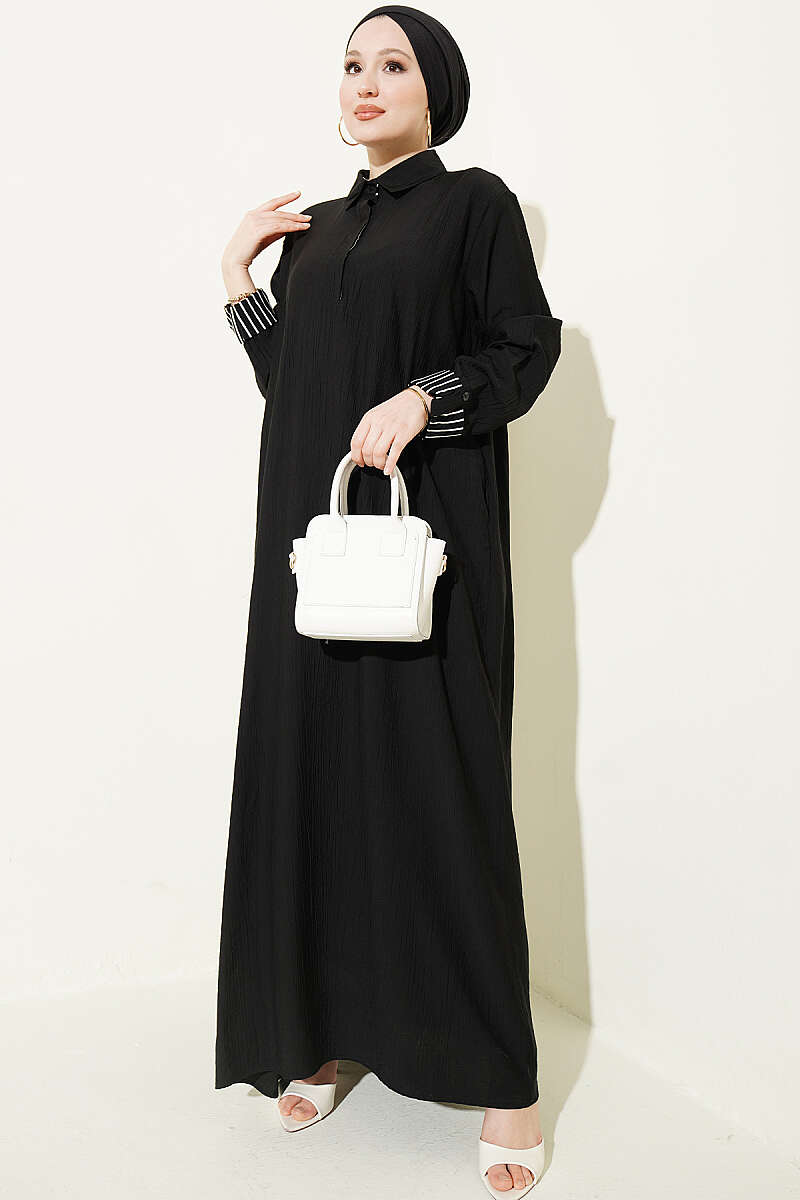 Bilek Çizgili Yarım Düğmeli Elbise Siyah